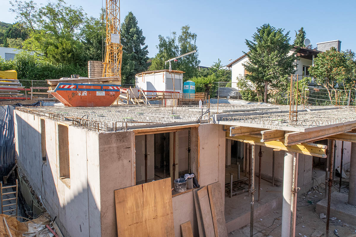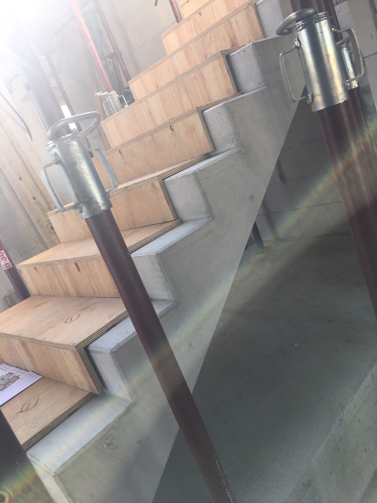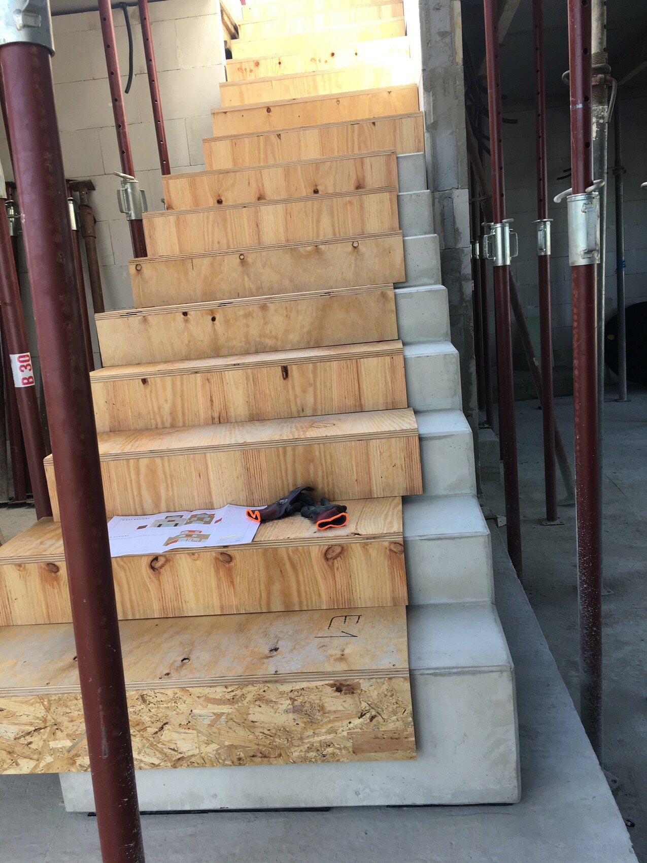 In unserer Hälfte ist die erste Sichtbeton Treppe eingebaut (hach) und verpackt, die zweite kommt morgen nach dem Gießen der OG Decke.