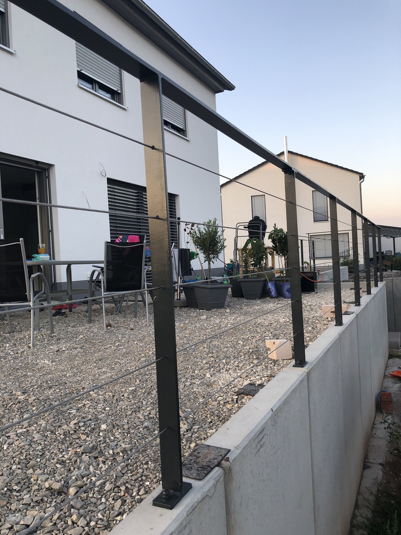 Zur Abwechslung auch ein Hausbaubild. Unser Terrassengeländer ist montiert. Die Absturzsicherung als Doppelstabmattenzaun auch.