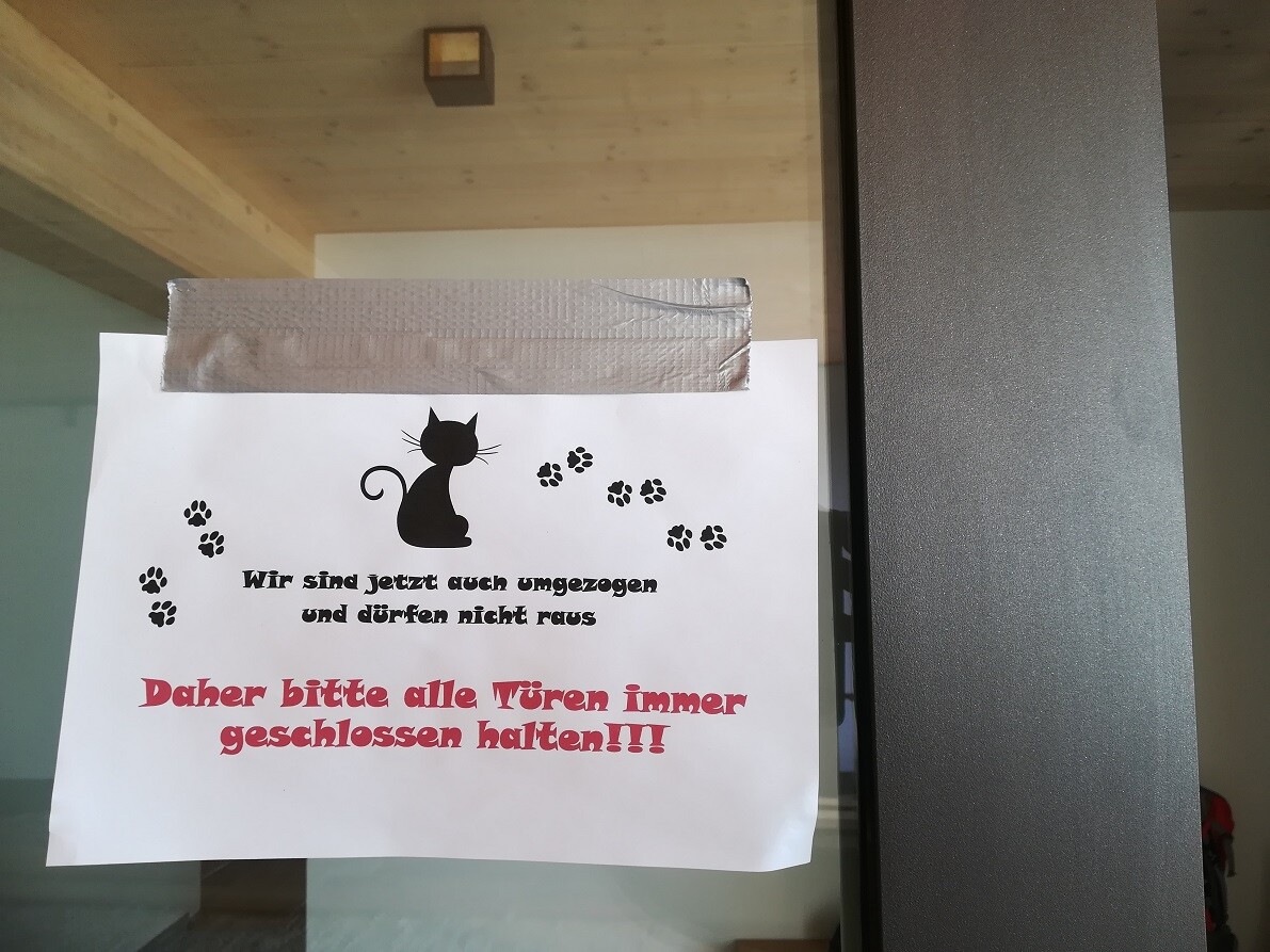 Und schlussendlich ist uns ein dritter Kater aus dem Haus ausgebüxt. Nachdem ja noch nichts fertig ist haben wir täglich noch Handwerker im Haus und irgendwann mußten wir halt umziehen, auch mit Katzen. Ich habe dann an alle Türen folgendes Schild gehängt: