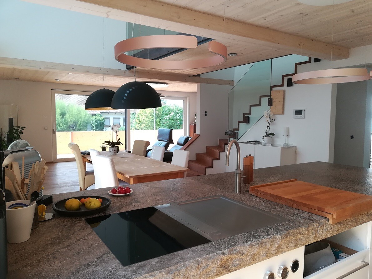 Offene Wohnküche mit Insel, Esstisch, Treppe, Holzdeckenbalken und runden Hängelampen.
