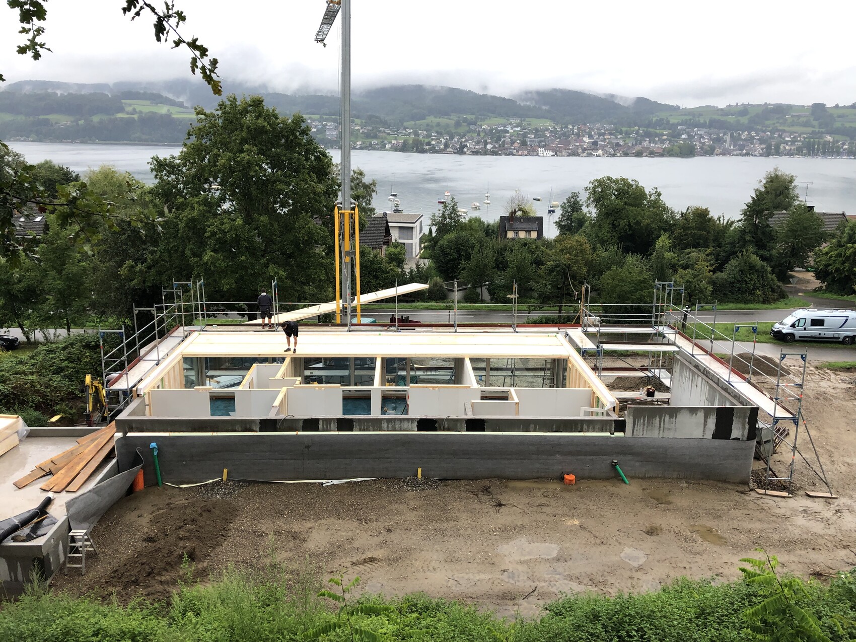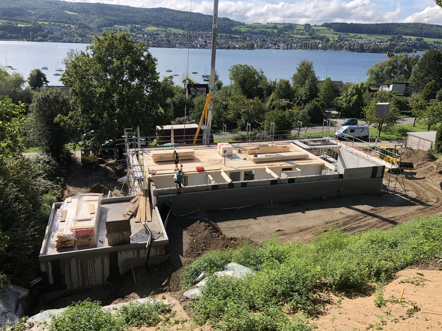 Baustelle am Hang mit Fundament, Holzplanken und Gerüst; See und Häuser im Hintergrund.