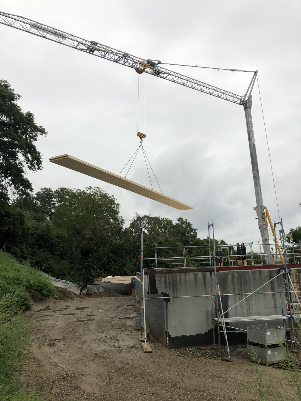 Die Decke über EG liegt. Die armen Zimmer haben gestern im strömenden Regen das erste Geschoss gestellt!