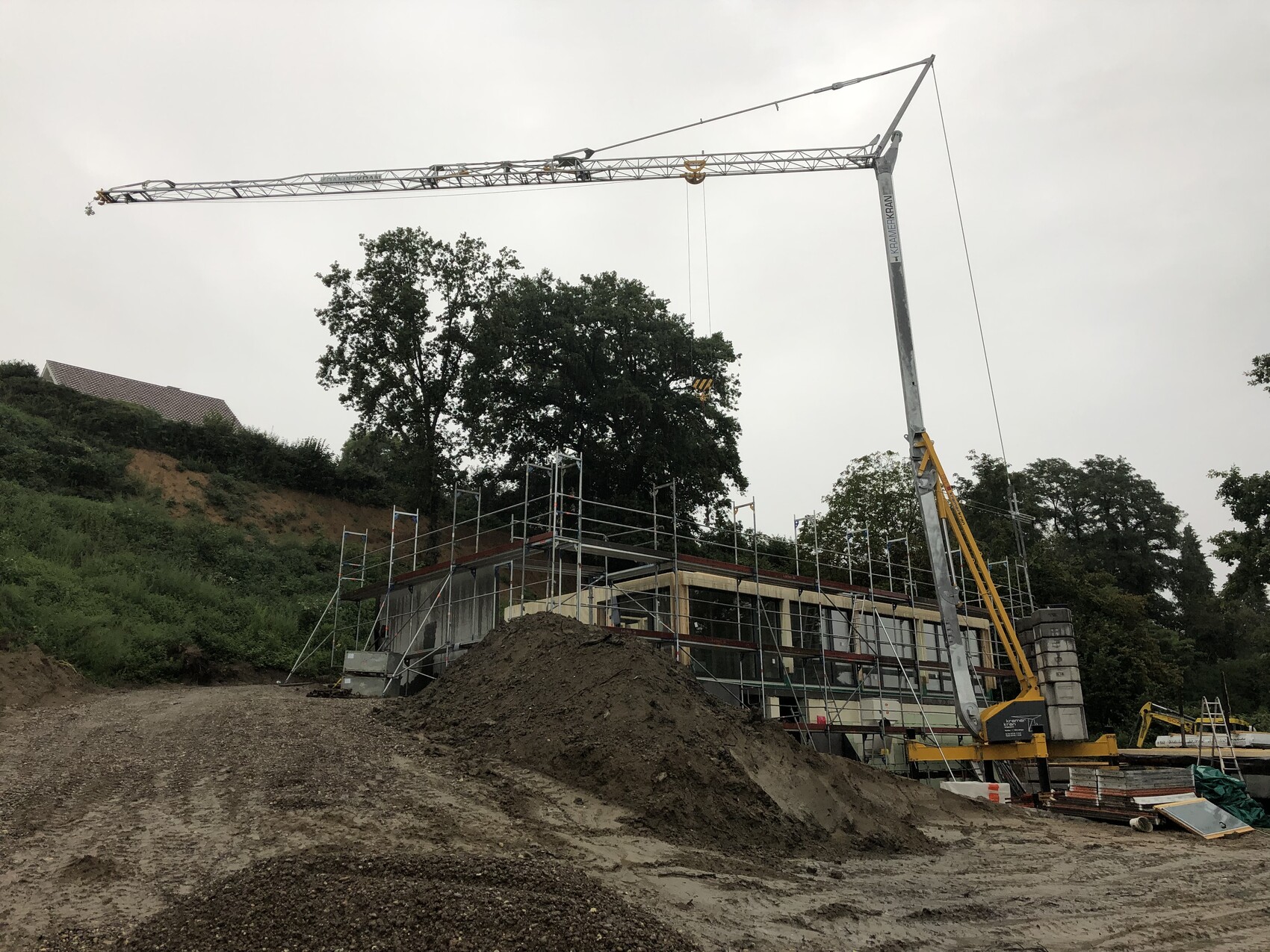 Großer Baukran schwenkt über Rohbau mit Gerüst, Erdhaufen und Baumaschinen auf der Baustelle.