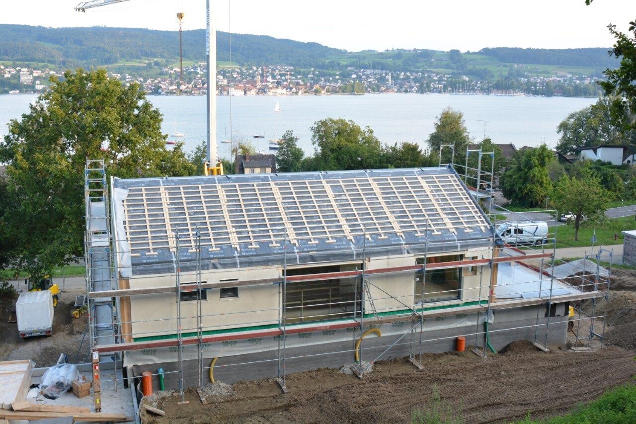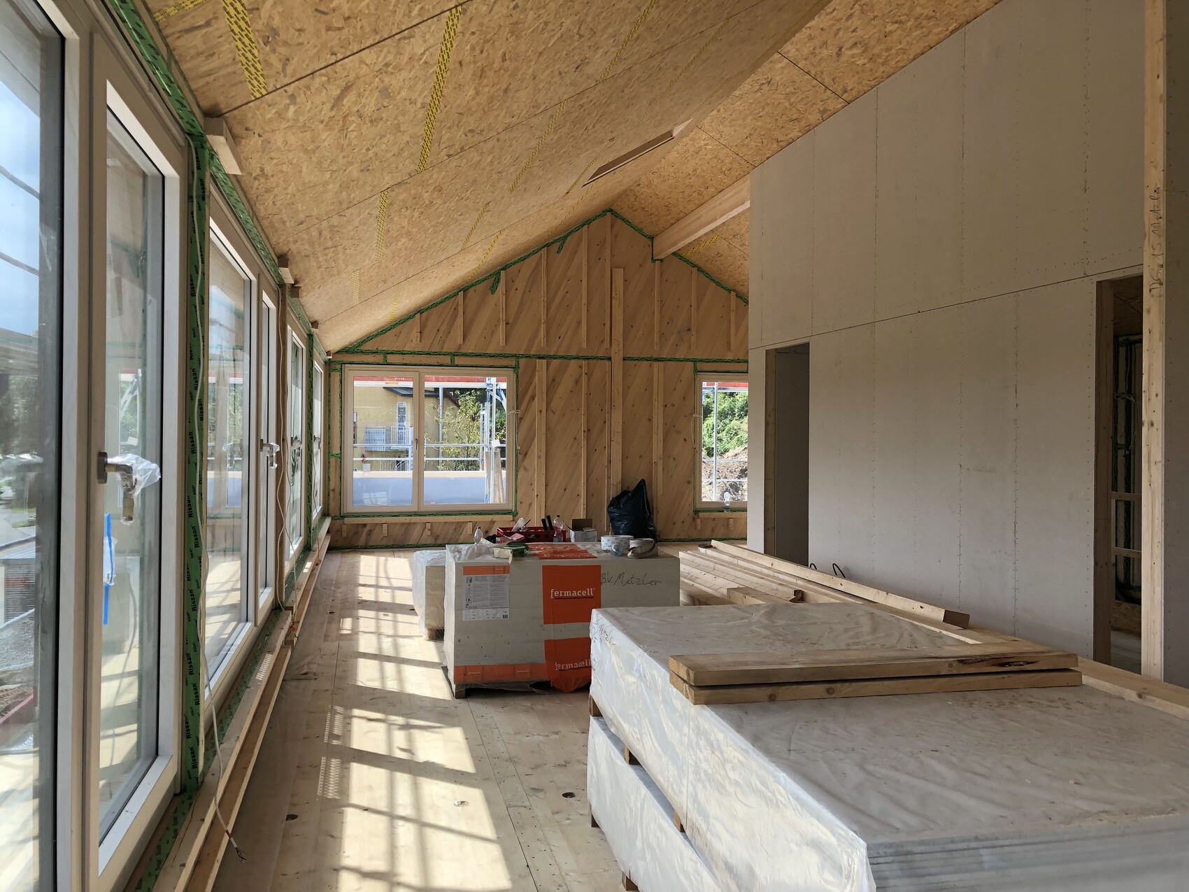Ah, endlich mal wieder Bilder vom Doppelhaus. Bissl zäh ist das ja schon bei Euch. Oder kriegen wir hier etwa nur die Hälfte mit? Ne das hast du schon richtig erkannt. Die Rohbau Jungs haben unvorstellbar rangeklotzt, aber alle anderen Herrschaften lassen sich bitten. Die Zimmerer haben mit der Bestellung beim Abbundzentrum getrödelt, dann kam das Zeug als nicht, dann waren sie in Ferien, also allein auf die Dachstühle haben wir 3 Wochen gewartet. Dann waren die Rohbauer in den Ferien, die noch die Innenwände im DG mauern mussten. Dann haben die Dachdecker sich bitten lassen und Elektro und Sanitär für die Rohinstallationen lassen sich gerade ebenfalls bitten. Kommen sie oder kommen sie nicht, jeder Tag ist eine Wundertüte. Dann haben wir uns ja so eine ungewöhnliche Sonderfarbe bei den Fenstern ausgesucht (Sheffield Oak light), nachdem der Fensterbauer nach Aufmaß 7 Wochen!!! für die korrekten Elementlisten gebraucht hat, braucht Aluplast nun wiederum ebenfalls Wochen, bis sie diese Folie mal aufziehen können.