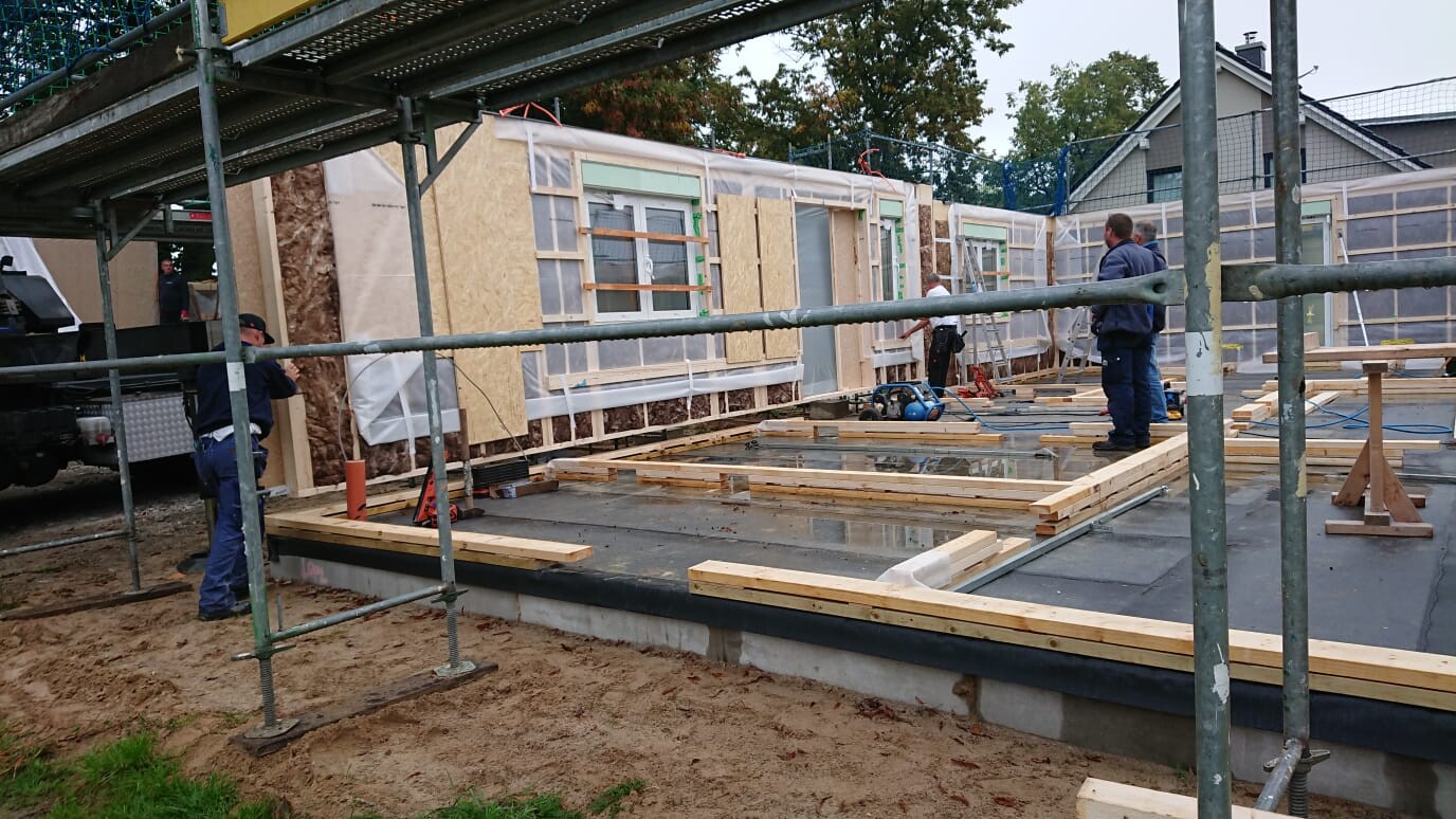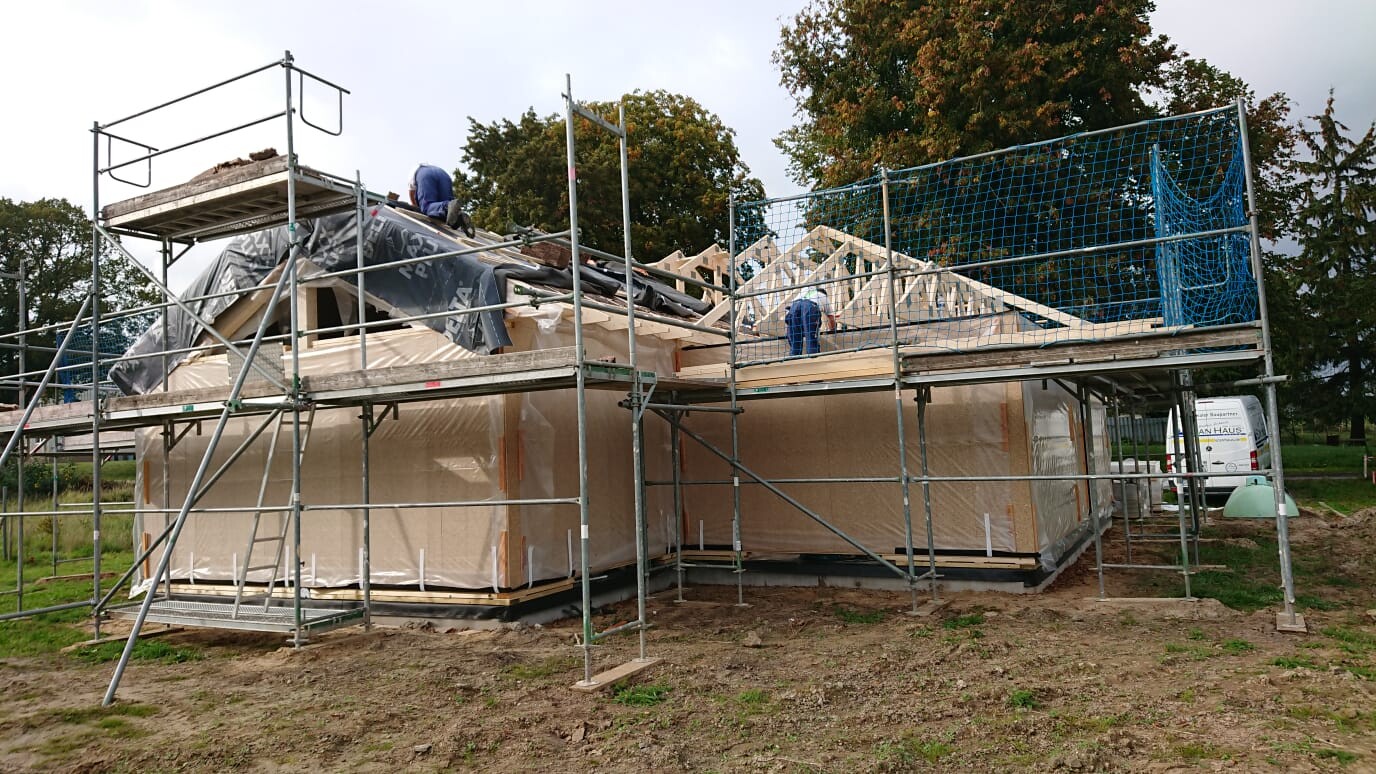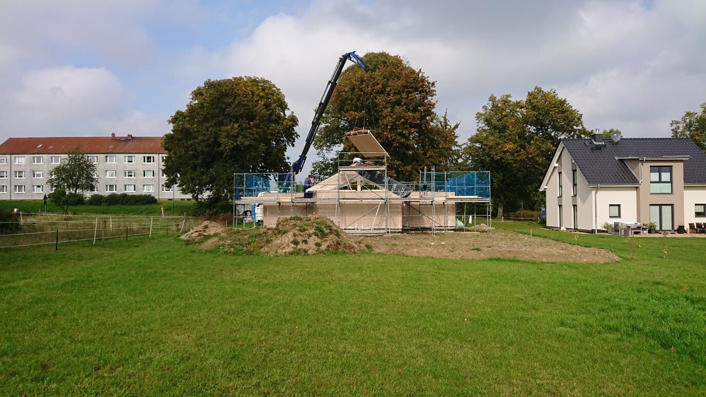 Dafür haben die Jungs heute richtig reingehauen und auch schon den Dachstuhl aufgestellt, den sie eigentlich erst morgen aufstellen wollten. Ich könnte mir vorstellen,dass es vielleicht damit zusammenhängt das sie am Freitag dann früher gehen können. Es sei ihnen gegönnt. Man merkt das die Leute schon lange zusammen arbeiten und mein Motto heute war: Solange der Bauleiter noch lacht, ist alles in Ordnung.