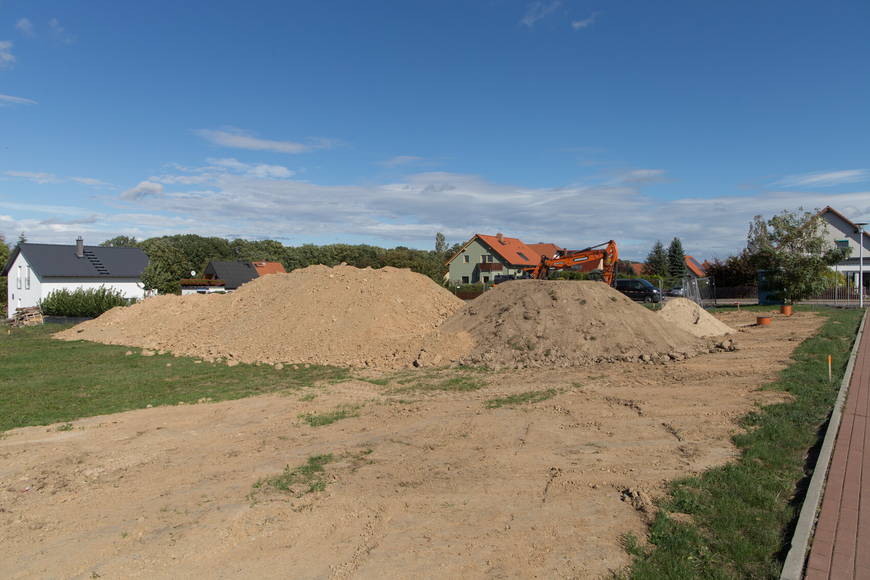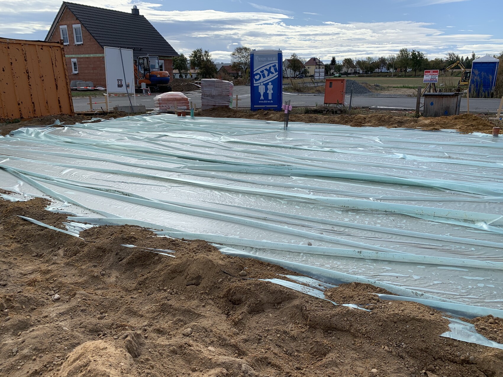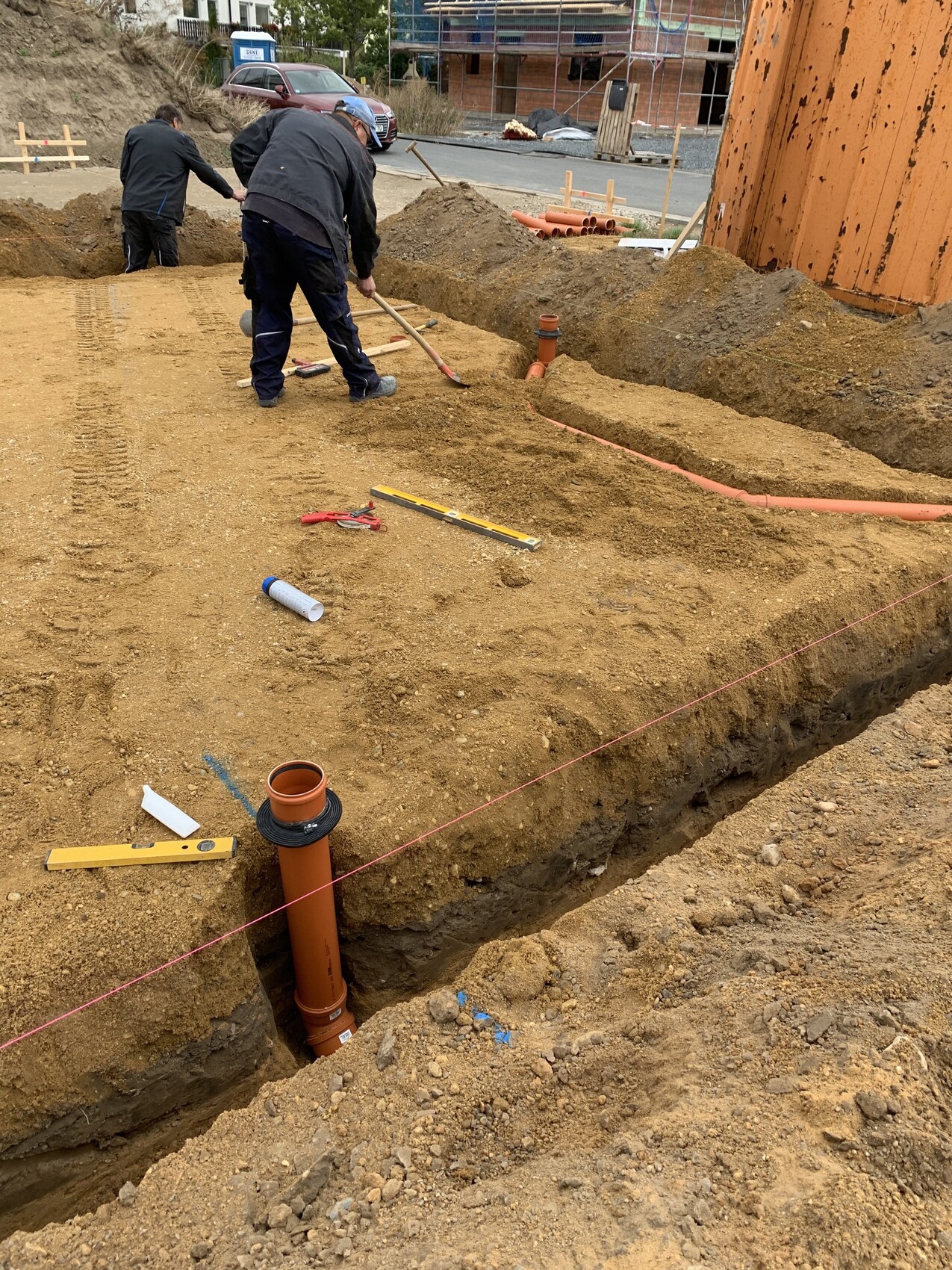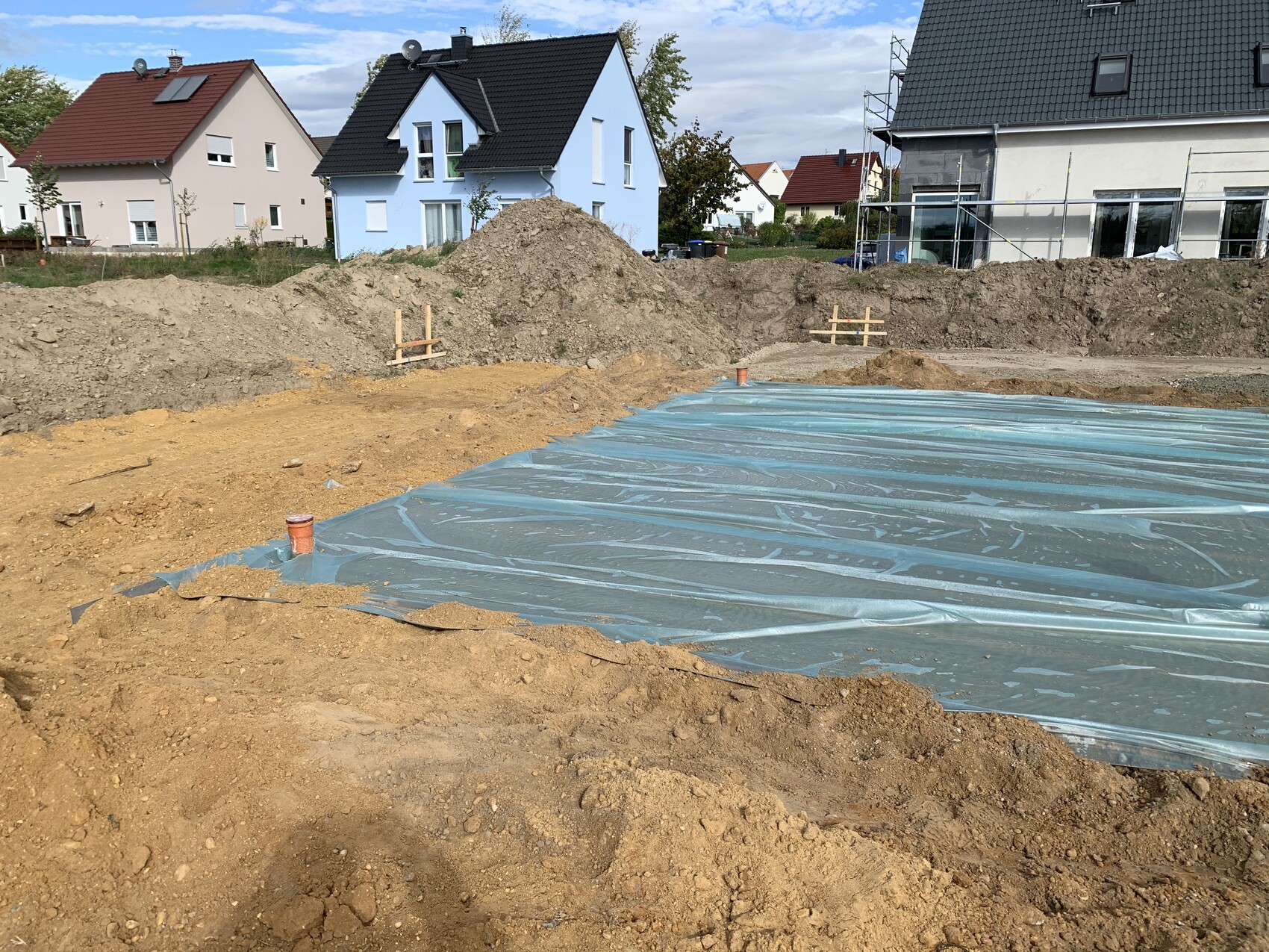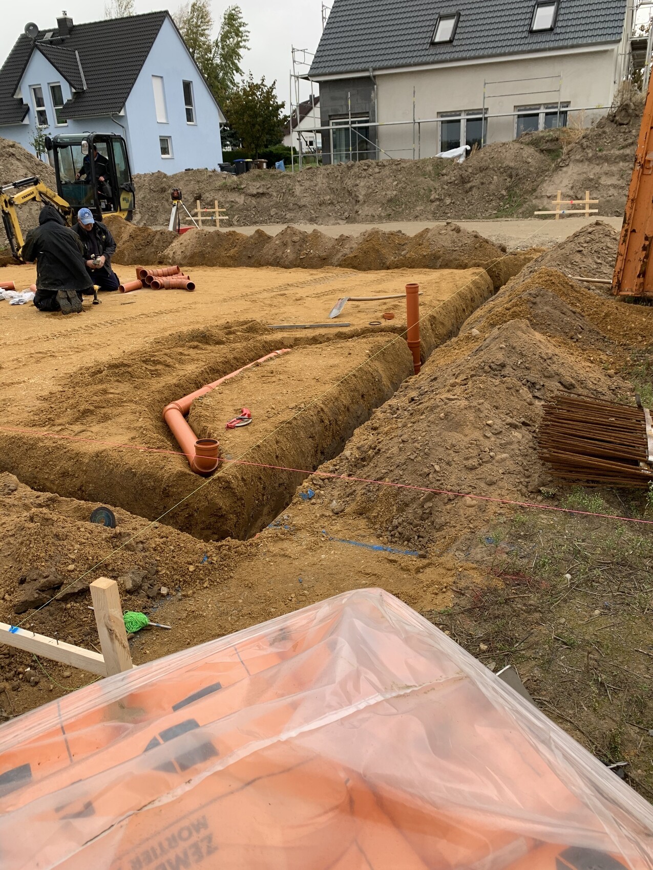 Das Grundstück ist rund 1200m² groß und außer der Baugrube und der Abstandsfläche zur Straße fast vollständig mit Aushub bedeckt. Vollkommen irre, was dort an gelockerten Erdmassen anfällt. Ich hoffe, wir können nennenswerte Anteile zum Verfüllen und auf dem Grundstück verwenden, sonst wird es teuer.