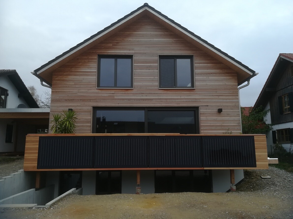 Ich mag diese unruhige Holzfassade ja echt gerne, aber die schwarzen Panels finde ich auch sehr unglücklick vom Design (der Blick fällt direkt darauf, man achtet auf gar nichts anderes mehr) und machen diese Ansicht leider kaputt. Ich würde da echt überlegen, die zu entfernen, auch wenn ich ein totaler Verfechter von Photovoltaik bin. Sieht mit den Panels und den Fenstern irgendwie komisch aus.