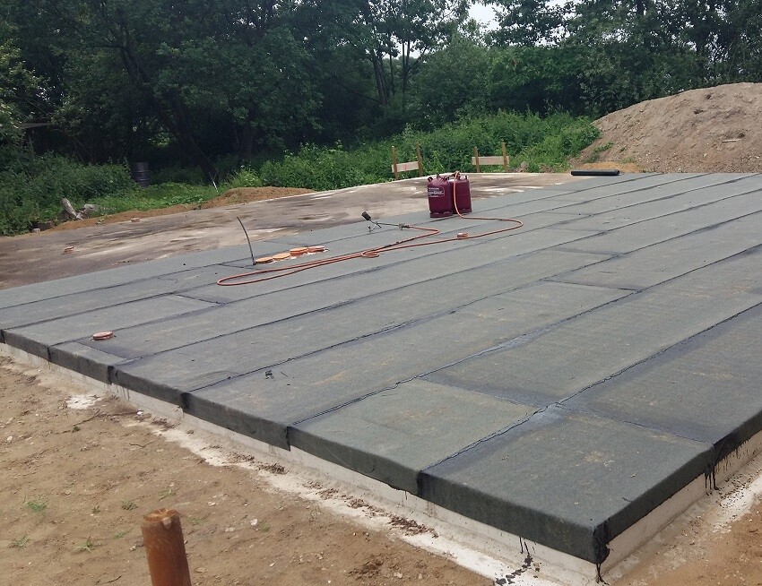 Große Betonfundamentplatte mit schwarzen Dämmplatten auf Baustelle; roter Kanister und Werkzeuge.