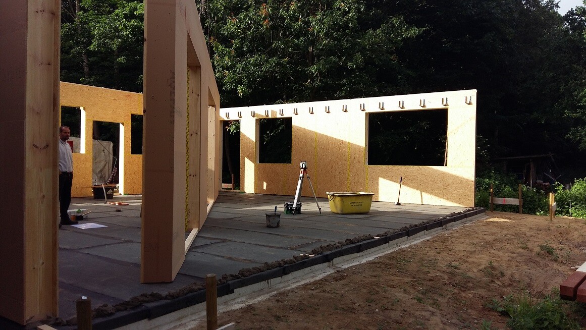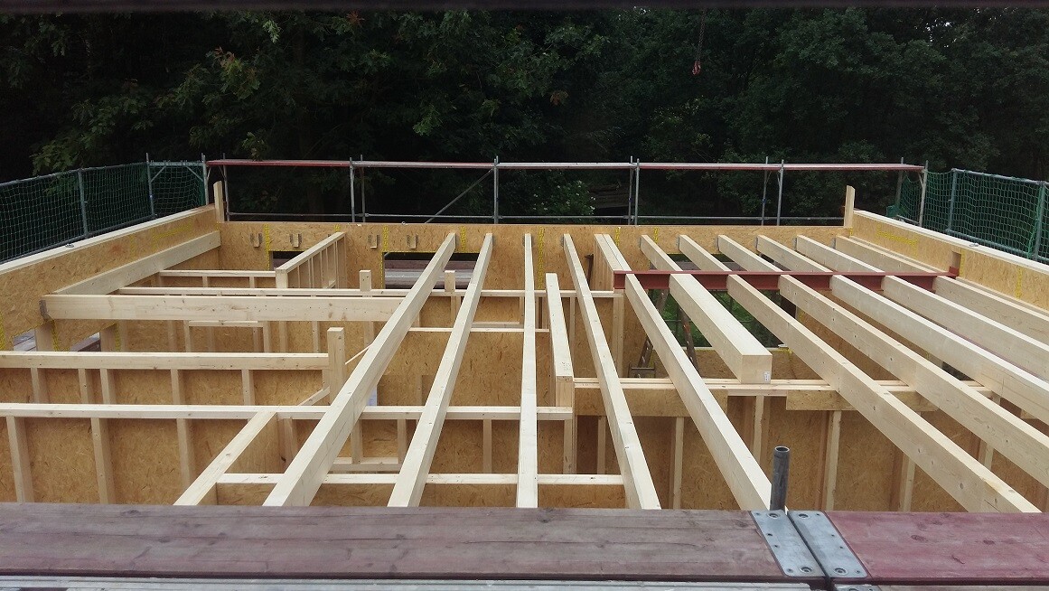 Holzrahmenbau auf Baustelle, Rohbaukonstruktion aus Balken und OSB-Platten