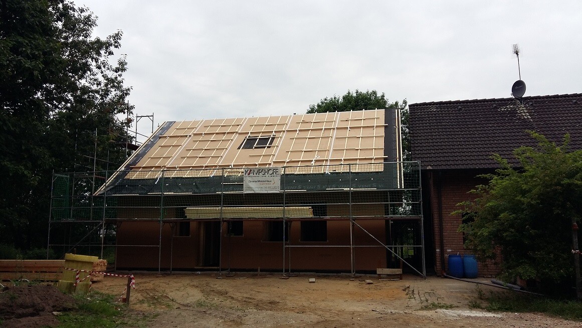 Einfamilienhaus im Rohbau: Holz-Dachkonstruktion, umlaufendes Gerüst, Baustelle vorne.