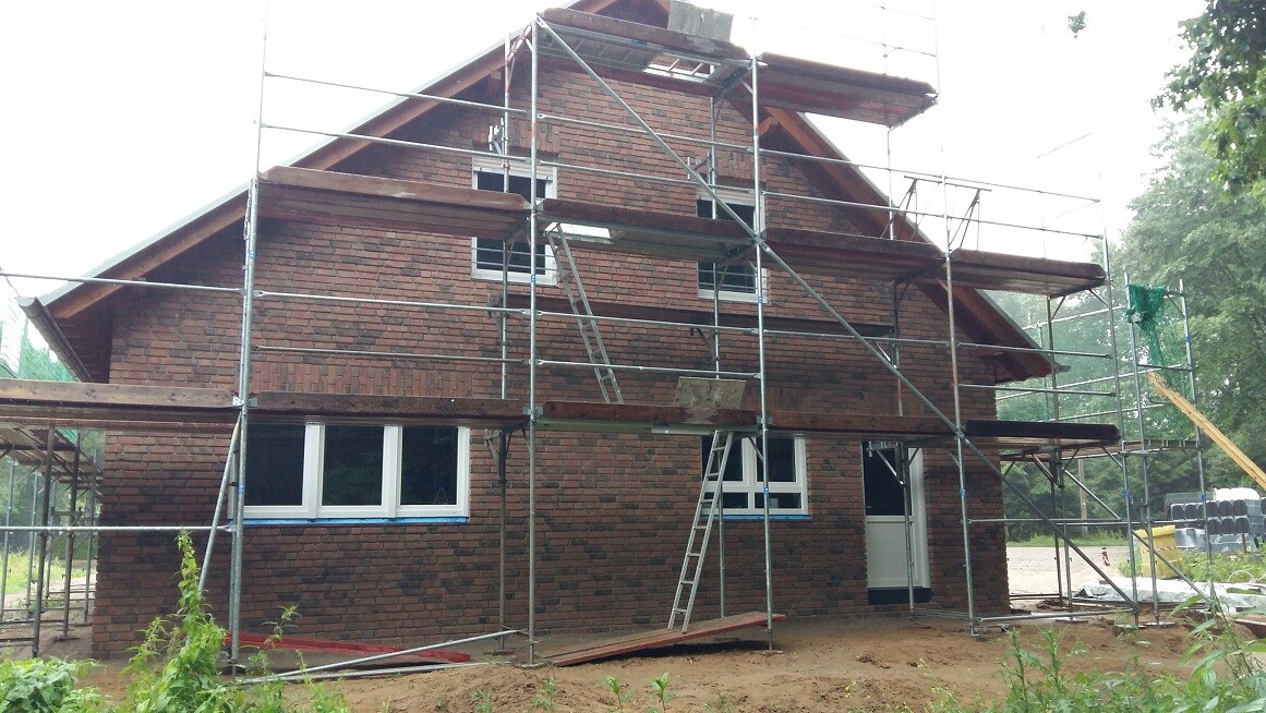 Backsteinhaus aus Backstein mit Gerüst und Leiter auf einer Baustelle.