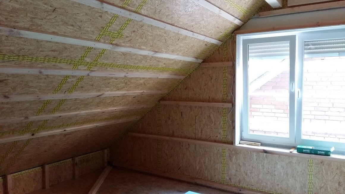 Dachboden-Rohbau mit Holzrahmen, OSB-Verkleidung und Fenster