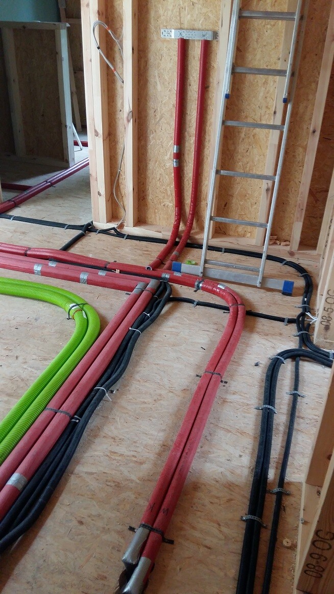 Verlegte rote und schwarze Kabel, grüne Leitung, Leiter im Rohbau.