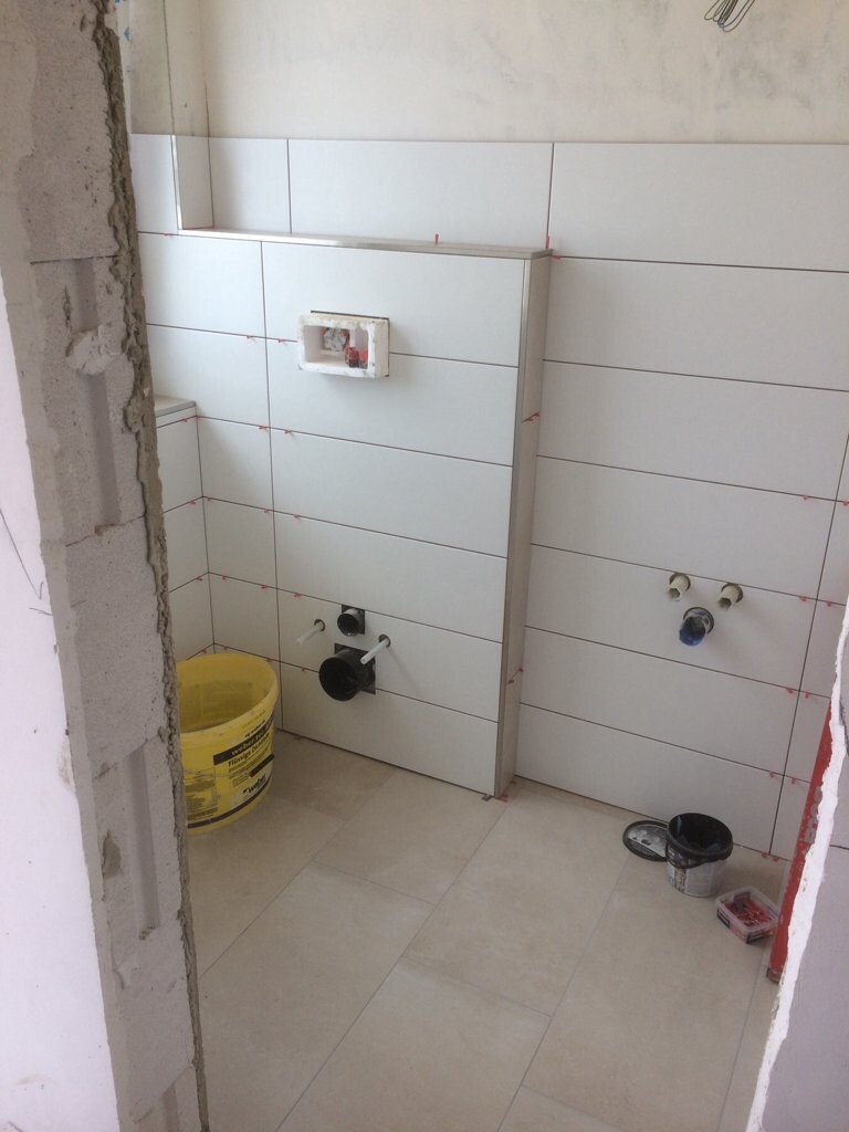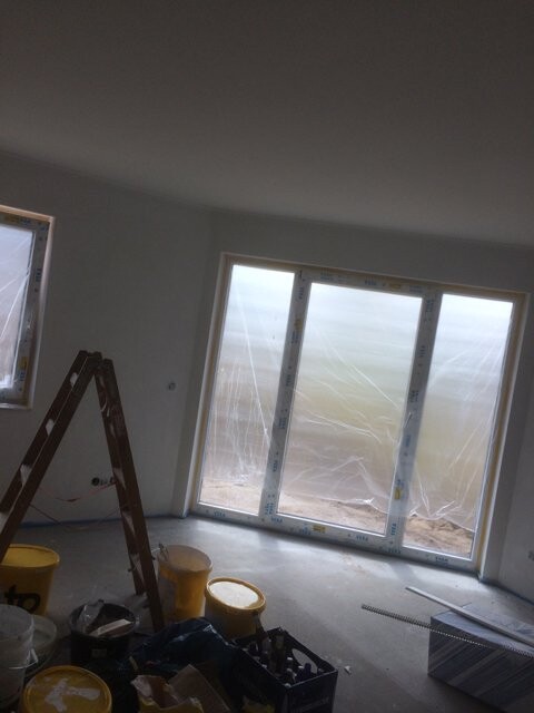 Montag kommen die Innentüren, damit der Fliesenleger die Sockelfliesen kleben kann. Freitag die Treppe, somit wird Mittwoch Flurgemalt in der Silikatwischtechnik.
