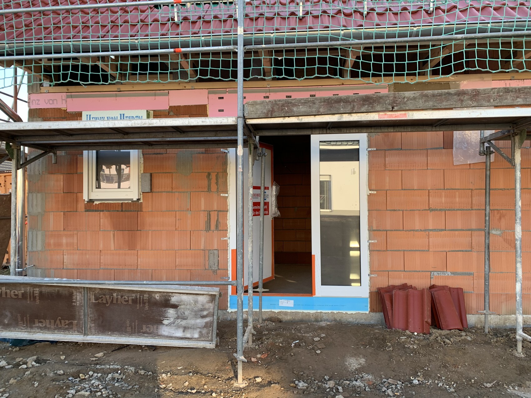 Haus im Bau mit Gerüst, rotem Ziegeldach und orangefarbenen Ziegelwänden; Bauarbeiten sichtbar.