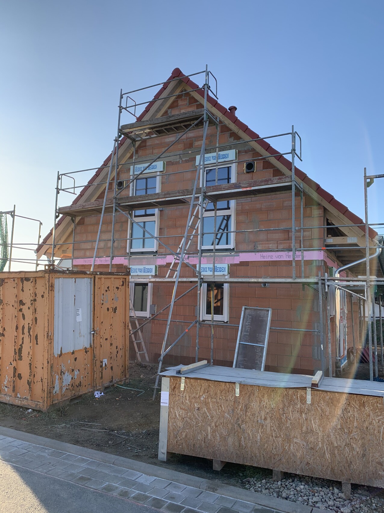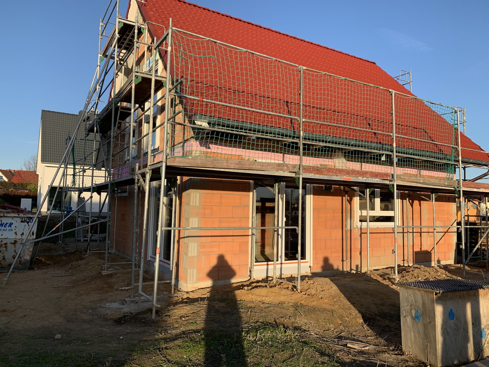 Unfertiges Ziegelhaus mit Gerüst, Fenstern und Baucontainer vor dem Haus