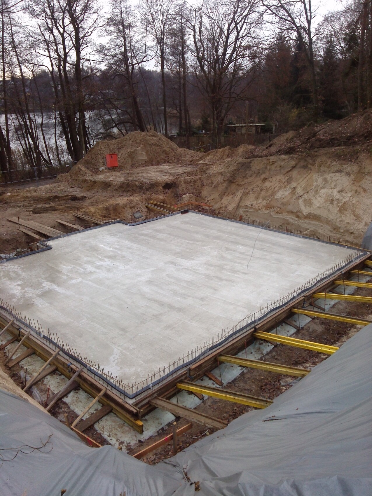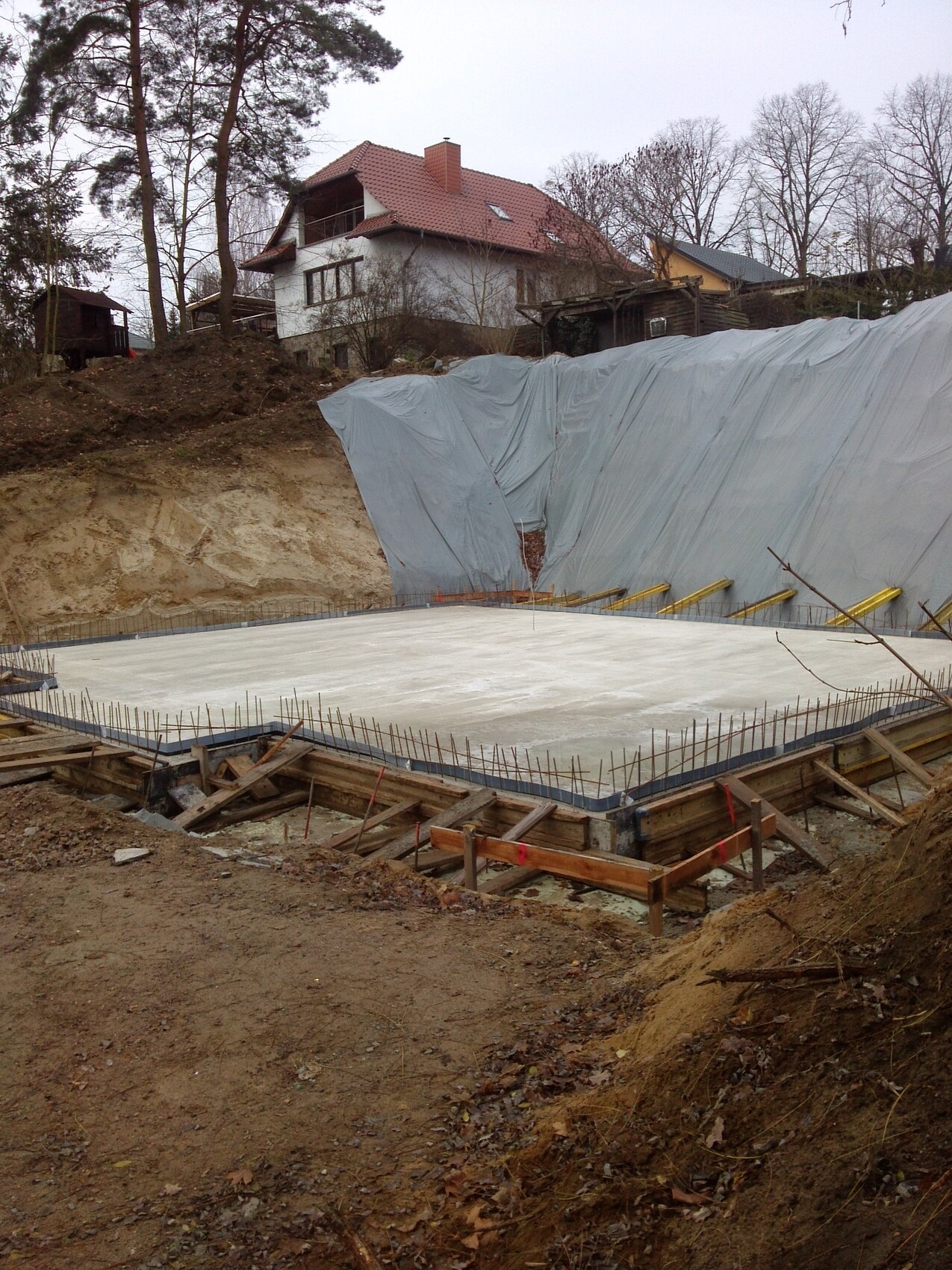 Bei uns wurde mittlerweile die Bodenplatte gegossen. Dadurch kann ich mir so langsam auch endlich mal die Dimensionen des Hauses richtig vorstellen. Morgen kommen die ersten Kellerwände und so wie es aussieht scheinen wir Glück mit dem Wetter zu haben, sodass es bis Weihnachten tagsüber zumindest immer so um die 5°C rum hat und dadurch die diesjährige Komplettierung des Untergeschosses noch im Bereich des Möglichen zu liegen scheint.