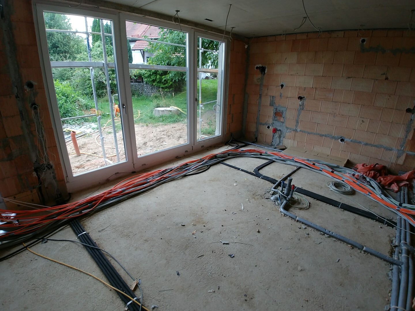 Rohinstallation Elektro ist nun auch endlich durch, am Montag muss nur noch durch den Schacht unter der Bodenplatte der Kabelstrang in den Technikraum gezogen werden.