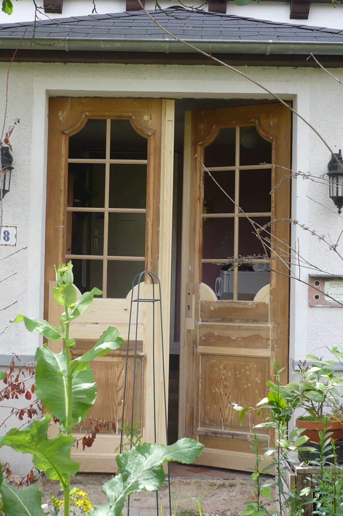 Kurzdoku Haustür: die war durch. Aufgrund der Maße und Denkmalschutz (und weil wir das auch nicht wollten), kam keine Baumarkttür infrage. Deshalb wurde sie in unglaublicher Friemelarbeit vom Schreiner unseres Vertrauens rekonstruiert. Sechs Woche ohne Haustür haben wir auch in der Großstadt gut überstanden, das Ergebnis war überzeugend, aber dann war erst mal wieder das Geld alle...