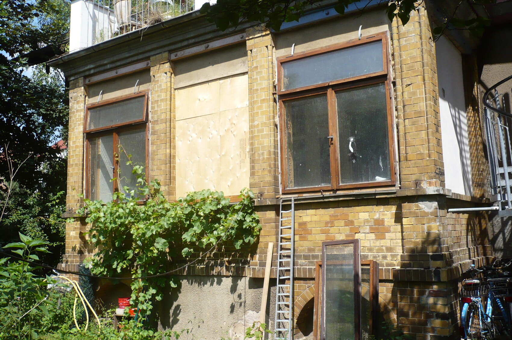 Das Haus ist laut offizieller Denkmalliste um 1900 erbaut, allerdings habe ich im Stadtarchiv die Bauakte gefunden, samt Bauantrag von 1860. Ursprünglich war das Haus ein Sommerhaus auf dem platten Land, bis sich um die Jahrhundertwende Leipzig das platte Land einverleibt hat. Eine reiche Witwe verbrachte hier mit Kindern und Kindeskindern die Sommer. Deshalb ist es auch, vom Grundriss her, nach modernen Maßstäben unbewohnbar.