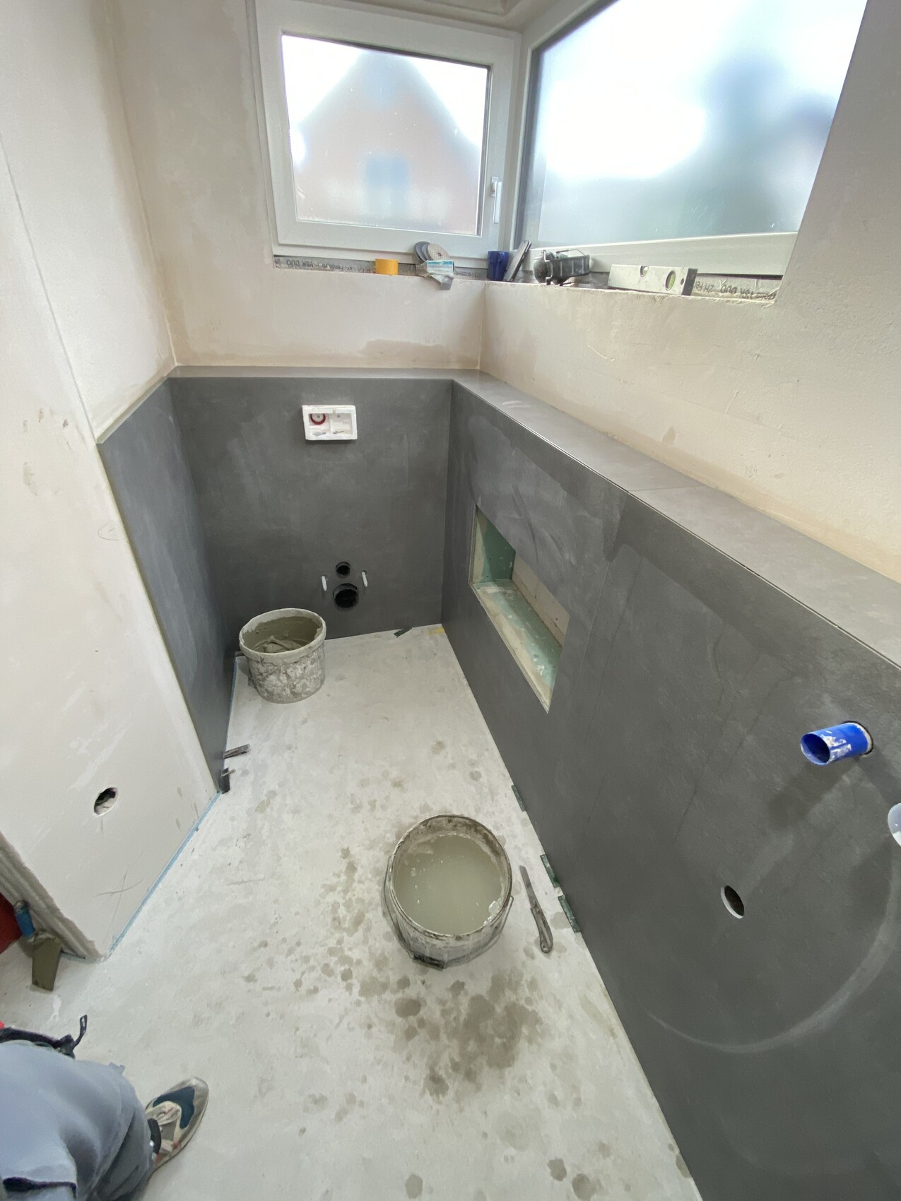 Im Gäste-WC kommen die Bodenfliesen 1,2x1,2m auch an die wand.