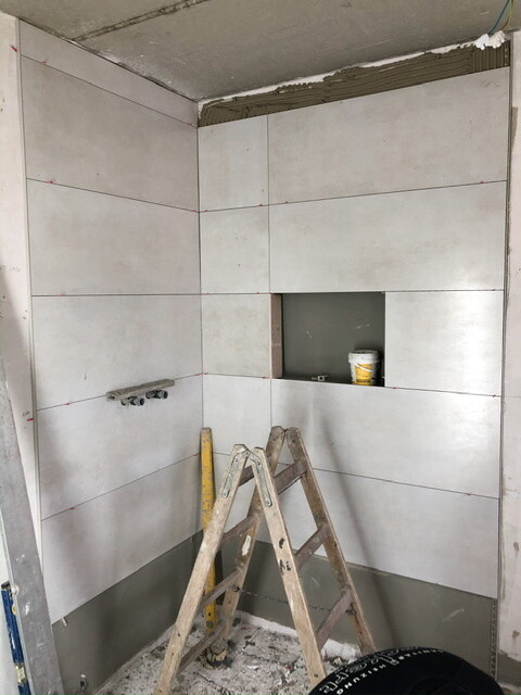 Im Bad ist es heute auch losgegangen. Morgen kommen die wandbündigen Fensterbänke (mit Schattenfuge) und die Maler. Und die Badewanne.