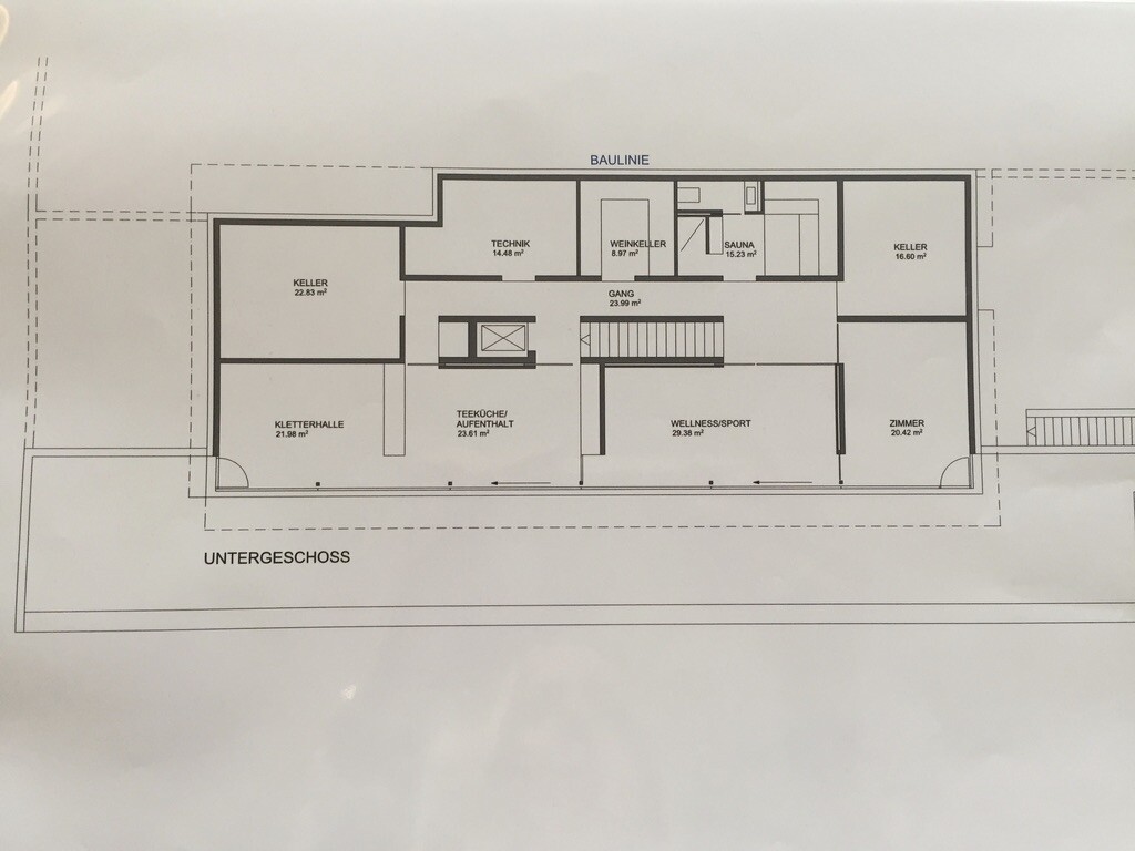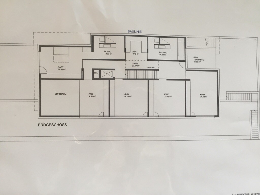 Habe mal ein bisschen im Archiv bei mir gekramt und eine erste Version des Grundrisses gefunden, damit Ihr so eine Idee hat, wie das Haus innen ausschaut. Wir haben allerdings einige Änderungen gemacht, die Bädersituation ist neu eingeteilt, Standorte sind aber geblieben (habe mittlerweile gelernt, dass Bäder ohne Fenster offenbar nicht üblich sind; wir haben unsere aber meistens in den Hang gepackt, damit man die Aussicht von den anderen Räumen aus geniessen kann). Koch- und Essbereich haben wir mittlerweile getauscht und den Abstellraum im Kindergeschoss gibt es auch nicht mehr, da ist jetzt ein Arbeitsplatz für alle draus geworden .