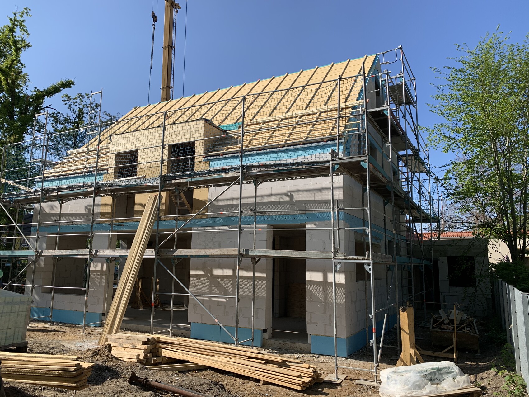 Haus im Rohbau mit Gerüst, Dachkonstruktion und Baukran auf Baustelle.