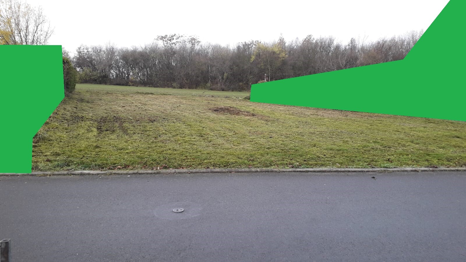 Grüne geometrische Flächen über einer grasigen Wiese vor einer Straße mit Baumreihen im Hintergrund