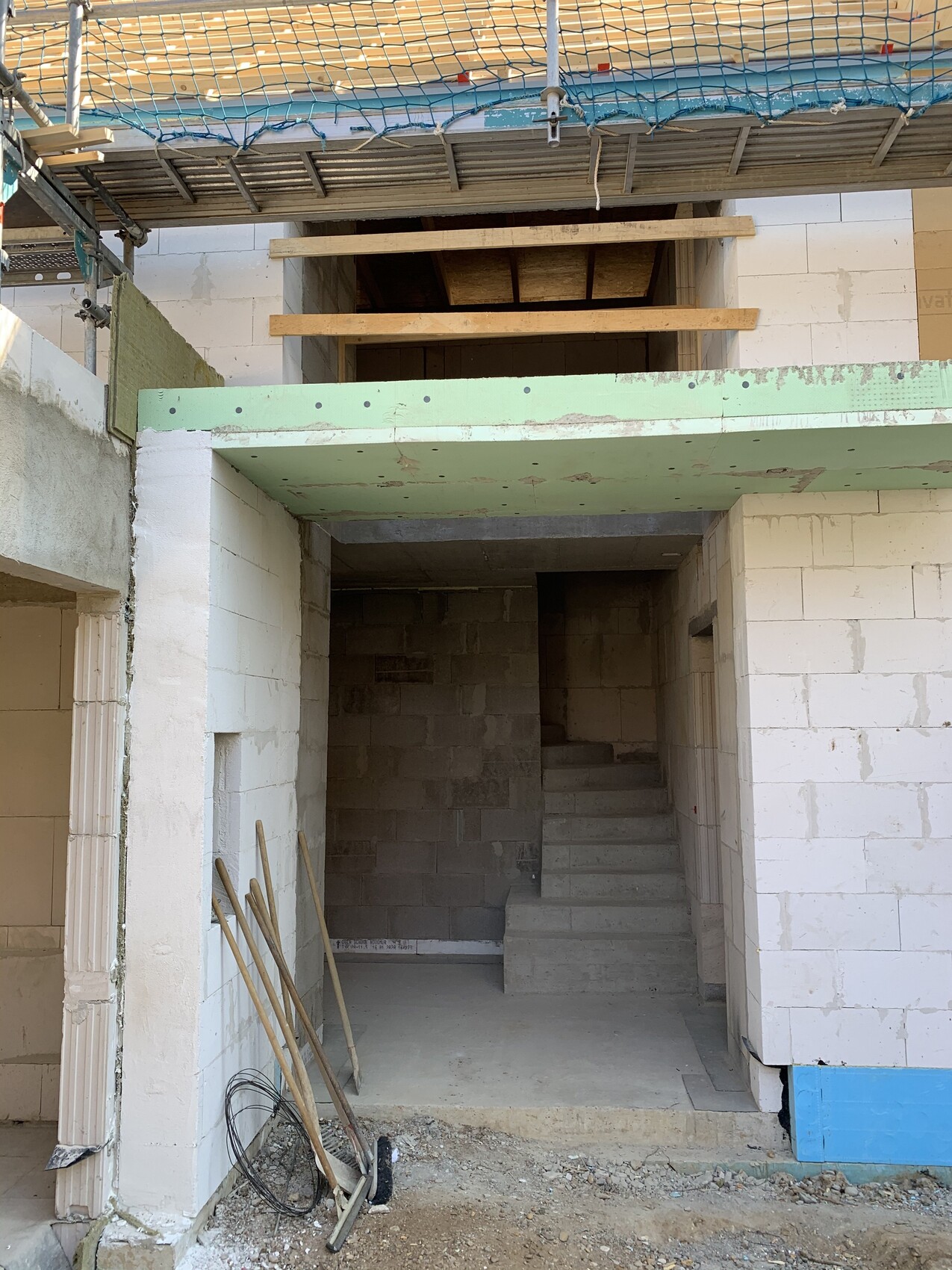 Rohbau: Offenes Treppenhaus mit Betonwänden, Holzbalken, Gerüst und Werkzeug.