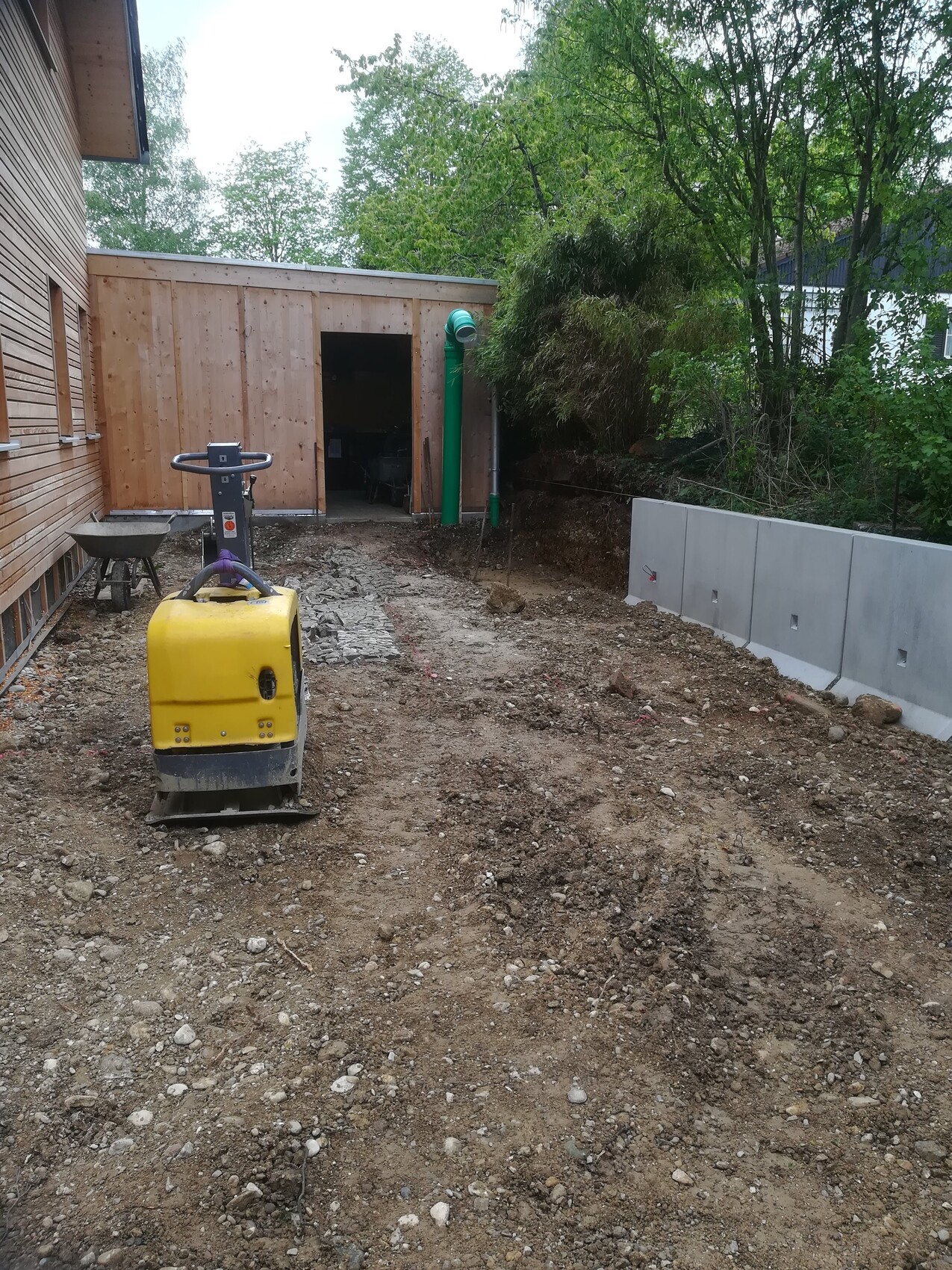 Alles naß und batzig... Immerhin ist die Mauer zum Nachbarn bald fertig. Dort soll ein kleiner Kompost und mein Brotbackofen hin (Richtung Schupfen) und davor dann unsere Terrasse. Durch den Brotbackofen verschwindet auch das blöde Austrittsrohr der Kontrollierte-Wohnraumlüftung aus dem Sichtbereich. Da werden wir uns noch was einfallen lassen, wie wir das etwas behandeln, entweder da rankt was rauf oder es wird eingehaust, mal sehen. Nachdem es da mal eingeebnet wurde, hatte man endlich mal eine Vorstellung, wie viel Platz da ist. Ich glaube, es wird uns reichen