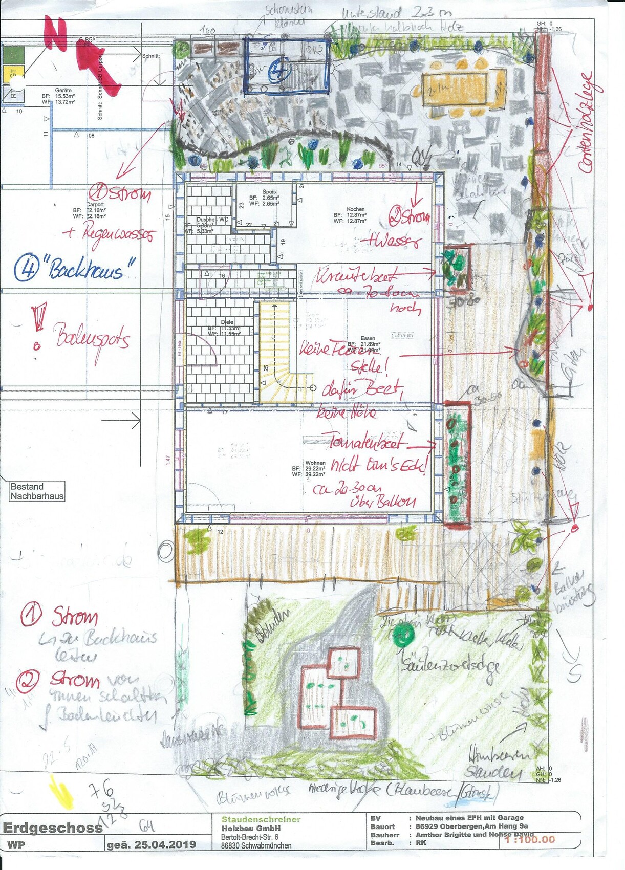 Da ist der Weg noch mit runden Begrenzungen. Unser Gartenlandschaftsbauer meinte aber mit den Blockdielen wäre es sinnvoller, daher jetzt eckig. Die häßliche Garagenwand zum Nachbarn wird mit Holzlegen aus Cortenstahl aus unserem Gesichtsfeld verschwinden (wir sehen nichts mehr und wenn der Nachbar an die Wand will, geht das sehr schnell und einfach), dann einen Sichtschutzzaun von 2m zur keifenden Nachbarin und ab der Küchentür, wie auf dem Plan ersichtlich, Holzterrasse, die in den Balkon auf der Straßenseite (den man auf meinem Profilbild sieht) übergeht. Wir haben nicht viel Garten, daher müssen die grünen Inseln dort gut geplant sein.