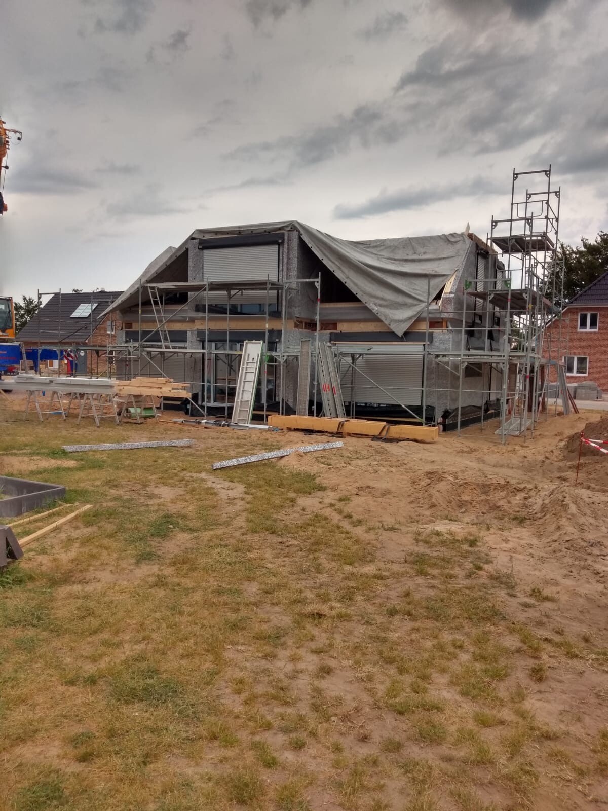 bei uns wurde letzte Woche Mittwoch/Donnerstag gestellt und gestern ist das Dach eingedeckt worden. Es lief alles reibungslos und auch das Wetter hat gut mitgespielt.