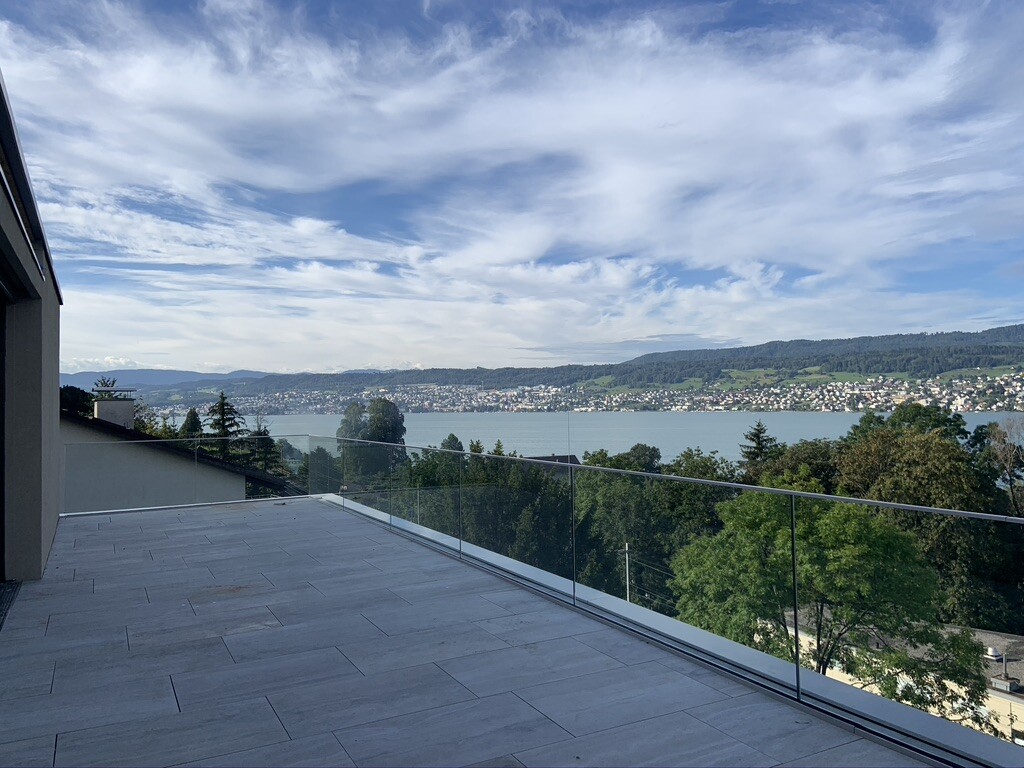 Terrasse mit Glaszaun, Blick auf See, Stadt am Ufer und grüne Berge.
