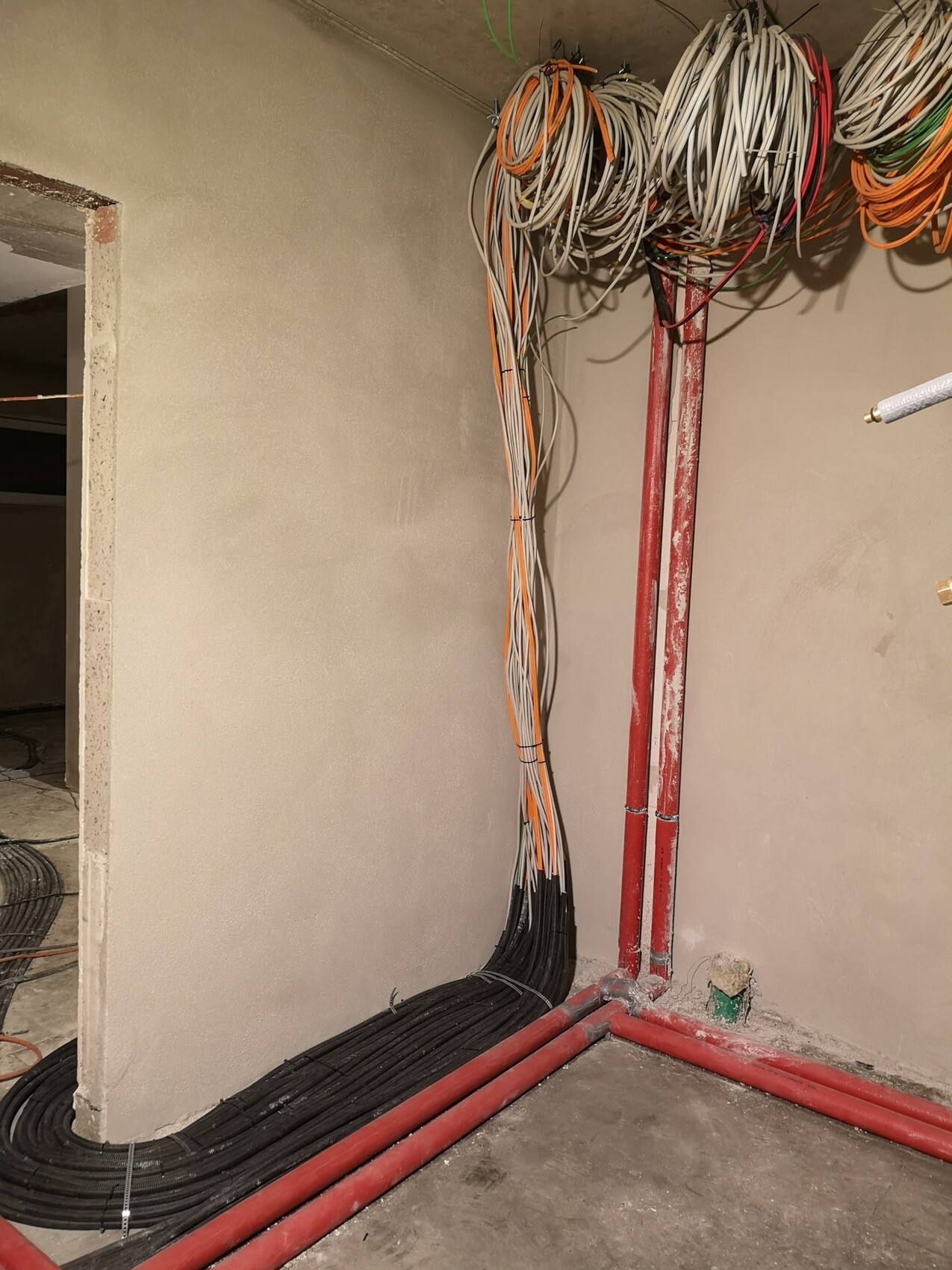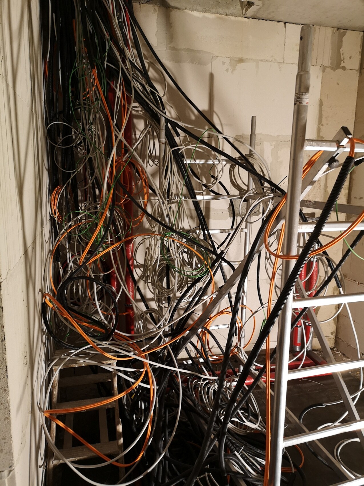 Da ich hier Bilder von Kabeln gesehen habe, muss ich meines mal Teilen. Nachdem ein Handwerker meinte, meine Kabel wären im Weg und er diese zur Seite gelegt hatte, gab es erstmal Chaos. Einen Tag später sah es dann aber besser aus und auch so, dass es niemand mehr ins Chaos stürzen kann. Zur Info: Es fehlen noch die Kabel die nach draußen gehen. Ist ungefähr noch mal so ein Ring der aber Links im Raum hing. Bin ich froh, dass das rum ist...