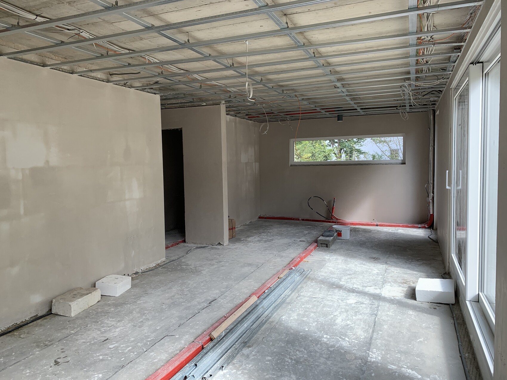 Und jetzt am Samstag der Estrich. Daher auch nur Fotos von der Haustür bzw. durchs Fenster, da der Estrich noch nicht betreten werden kann.