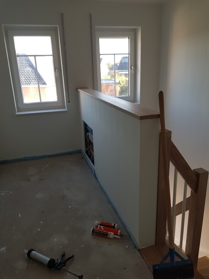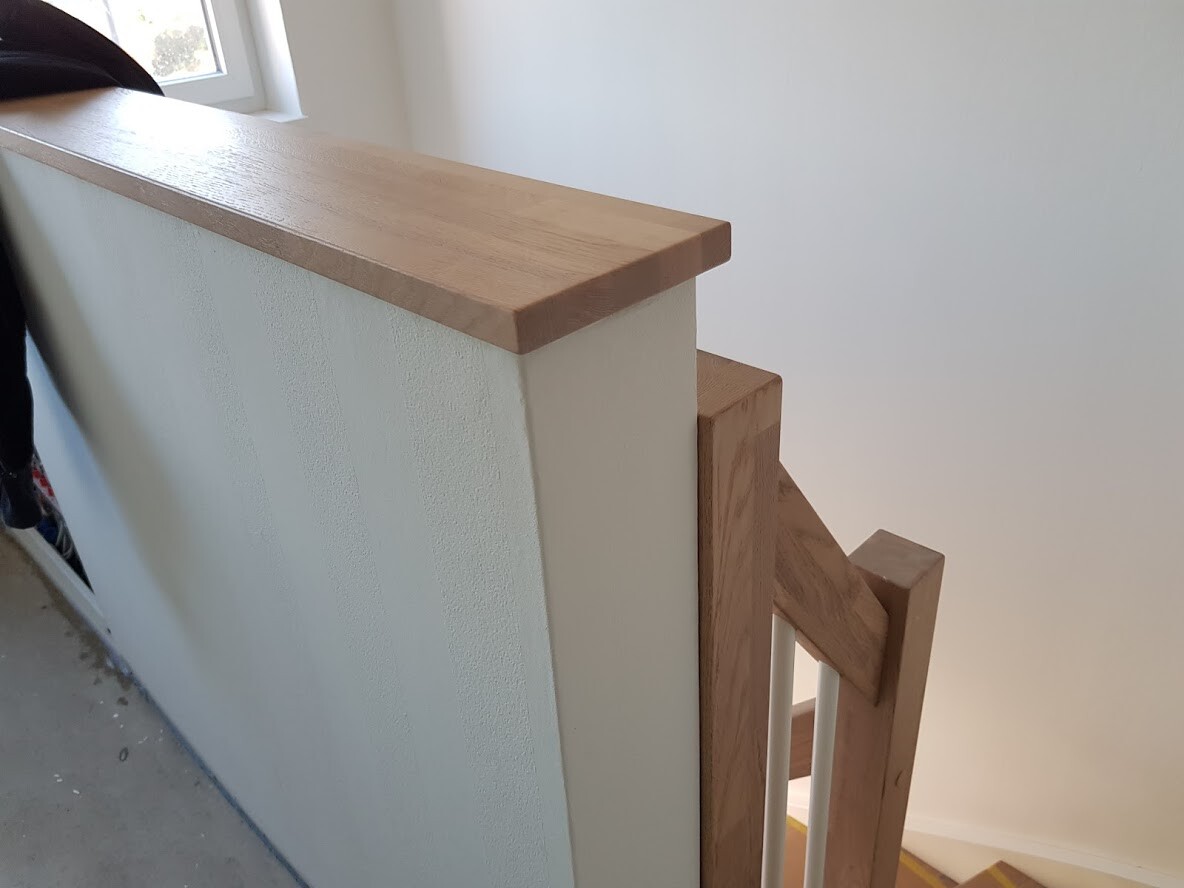 P.S.: Der Pfosten der da oben so 1cm weit in die Treppe reinragt sollte laut Planzeichnung eigentlich bündig mit der Brüstung enden. Das stört mich optisch ein bisschen.