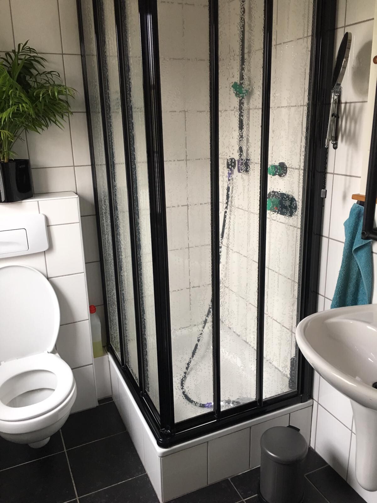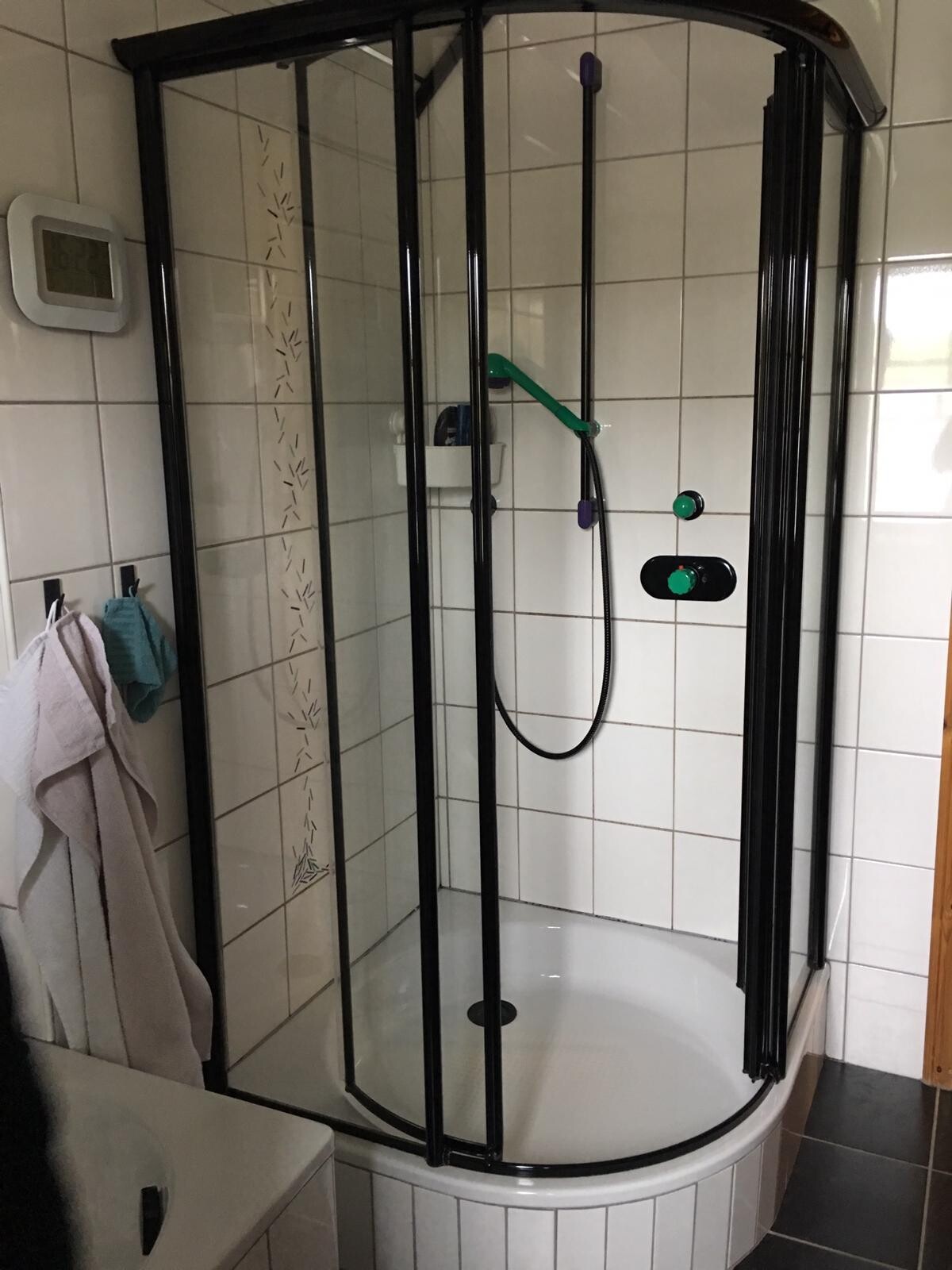 Die Dusche sieht so aus (noch ohne Einbauschrank):Jaa, viel besser. Dieses schnöde grau mit diesen 70er Jahren Ornament-Fliesen...das hat man einfach nicht mehr. Die Akzente mit den schwarzen Rahmen und den grünen Armaturen....sehr modern!