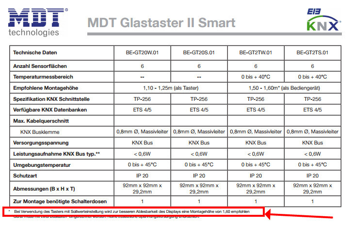 Empfohlene Höhe ist 1,50-1,60 laut mdt (Webseite). Die Taster erlauben aber jede Höhe und sind immer les- und bedienbar.