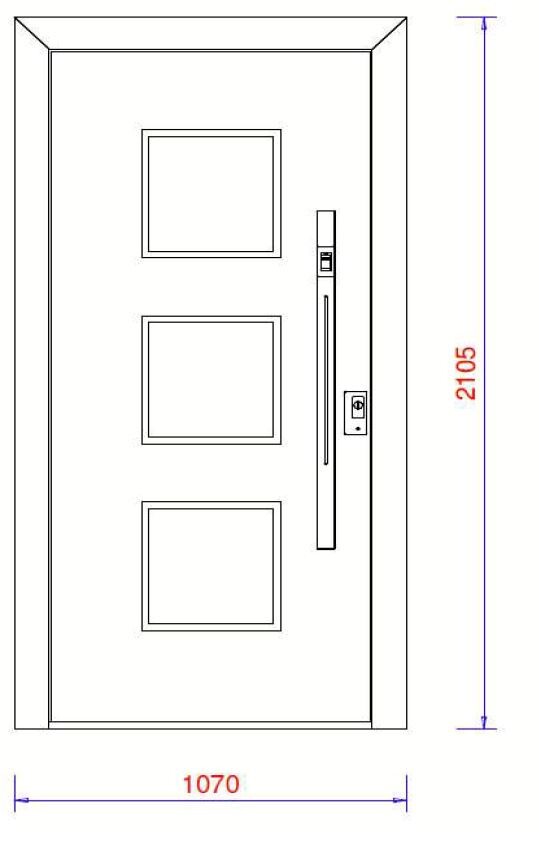 Türfront mit drei quadratischen Feldern, senkrechter Griff, Maße 1070 mm × 2105 mm