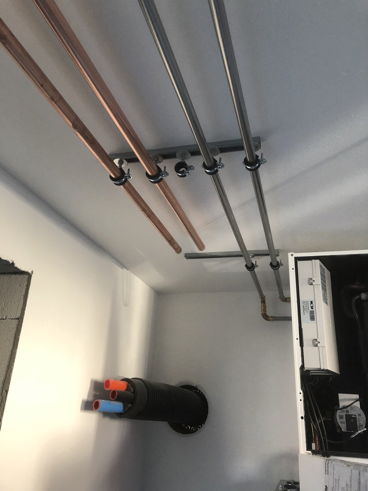 benediktr08.03.21 19:05Heute mal etwas von der technischen Seite. Als gelernter Installateur stelle ich natürlich einen hohen Anspruch an die Ästhetik verlegter Leitungen/Rohre. Hier einmal zentraler Steigschacht bis ins Obergeschoss für Heizung, Wasser und Elektro. Zweites Bild aktuelles Kabelgewirr im Technikraum. Drittes Bild Anbindung Wärmepumpe.