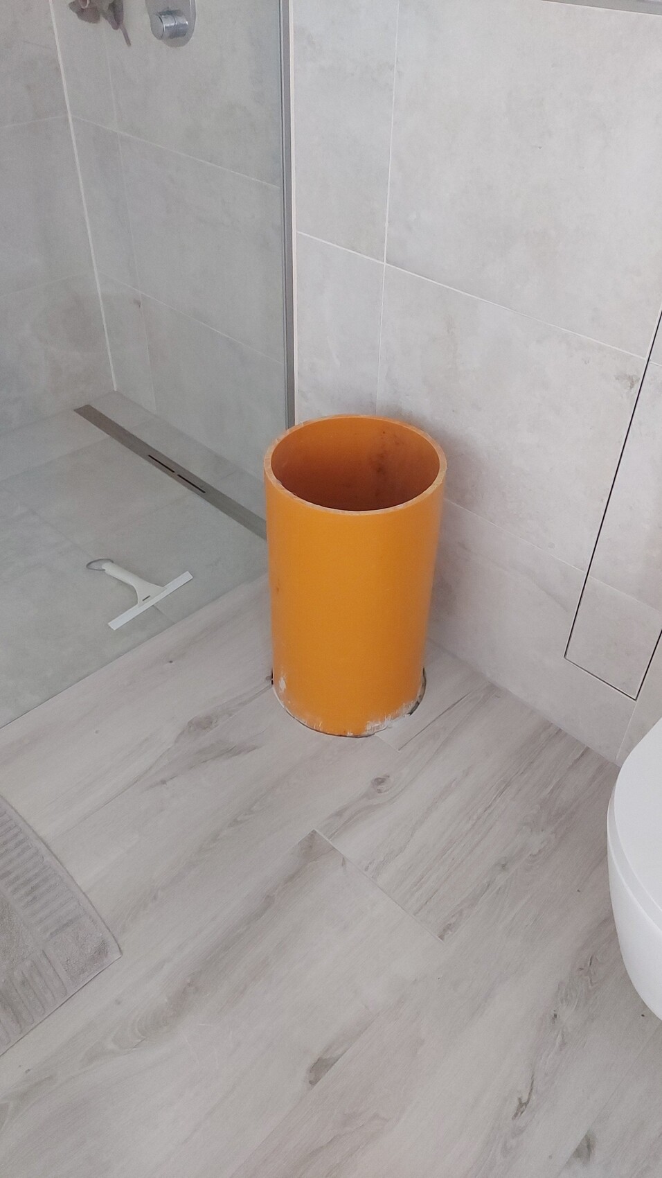 Orangener offener Zylinder aus Kunststoff steht im Badezimmer neben der Dusche.
