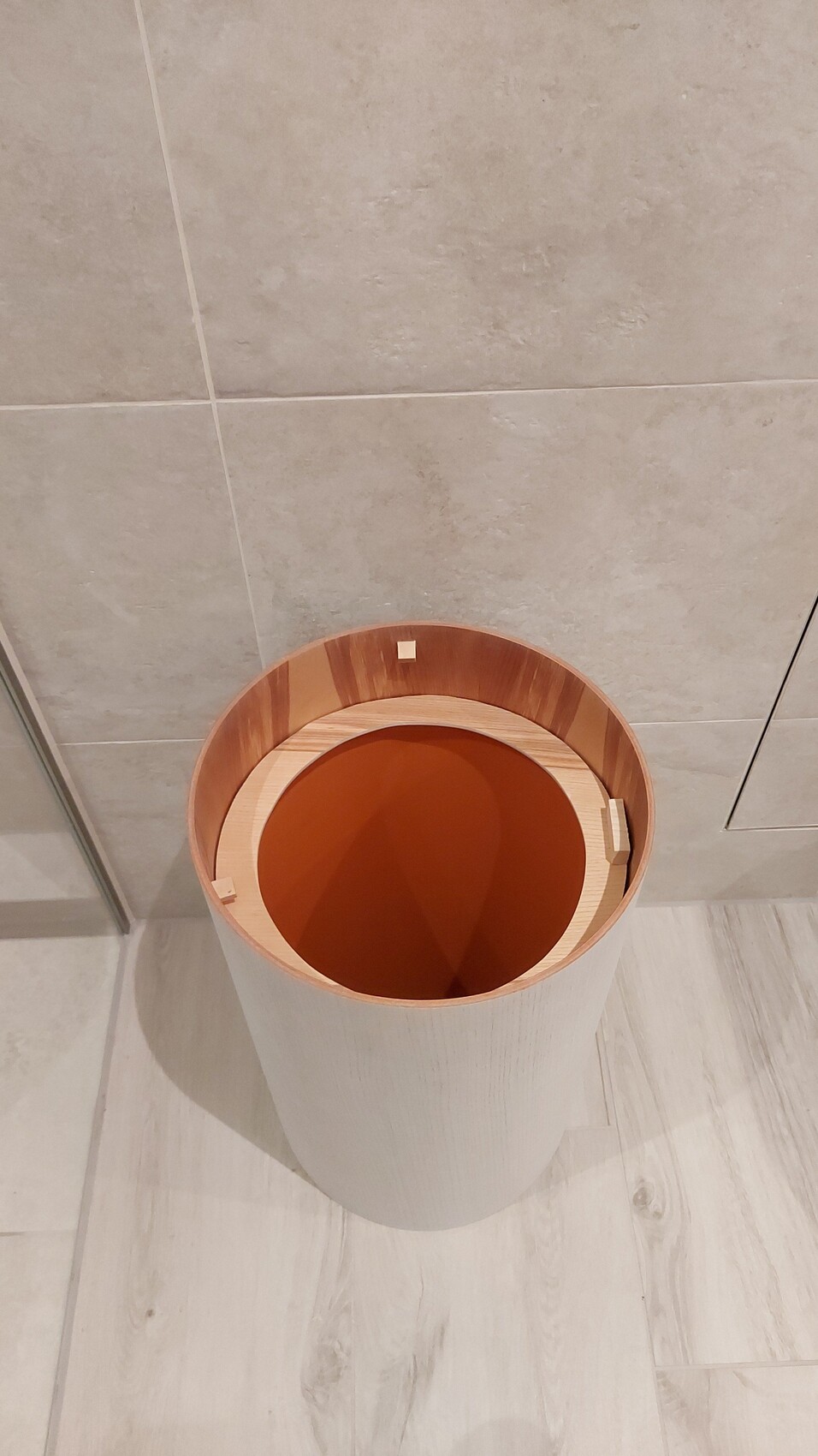 Offener runder Holzbehälter (Eimer) mit orangefarbener Innenfläche im Badezimmer.