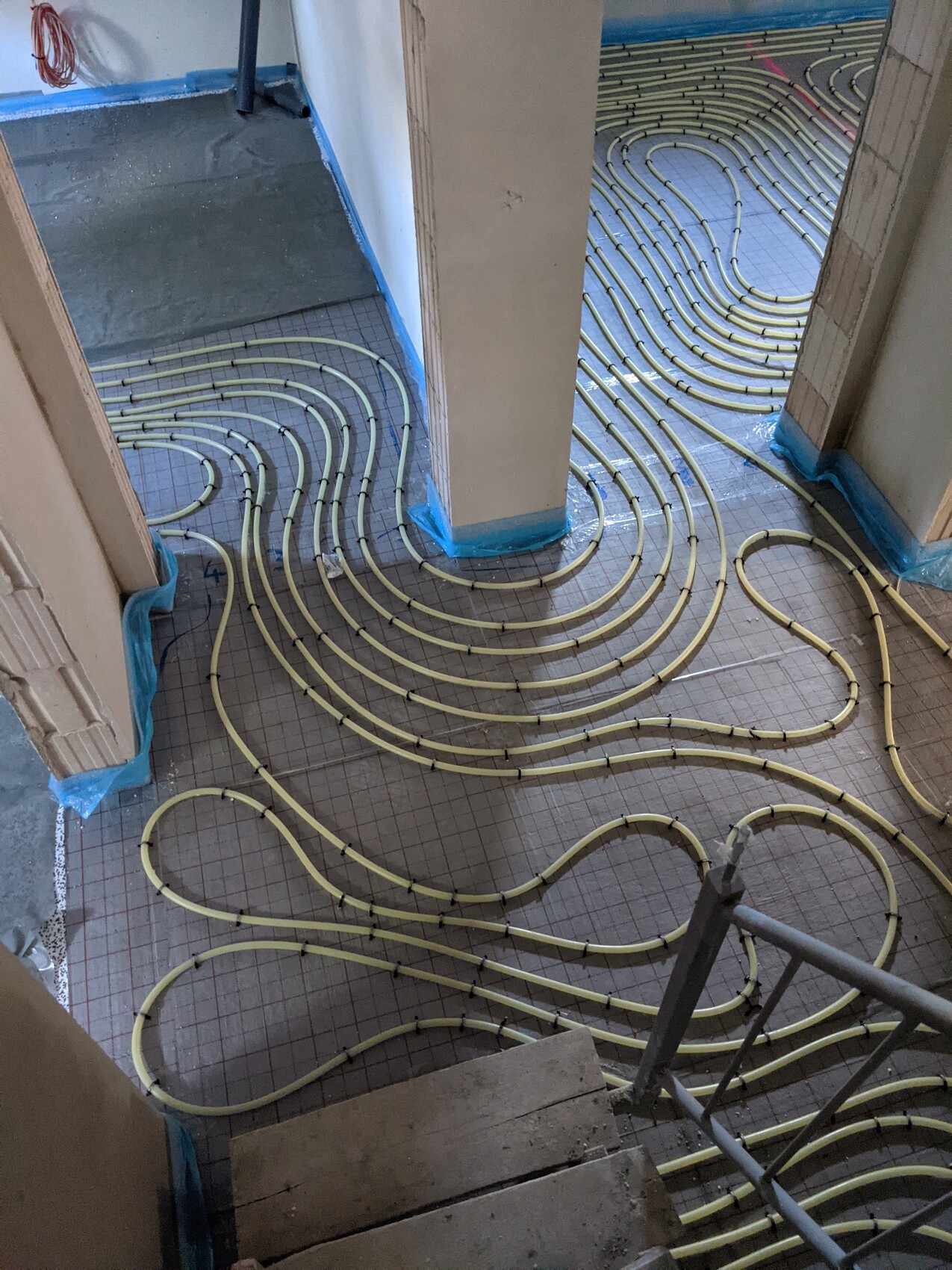 Der Flur im Keller ist leider nicht so schön geworden, aber da dies kein Wohnbereich ist, ist das nicht so wild. Ansonsten sind bislang alle Kreise zwischen 75m und 85m. Ein Kreis muss heute allerdings wieder raus, da das Rohr an einer Stelle geknickt ist. Aber Übung macht den Meister und Rohr haben wir mehr als genug in Reserve 😉