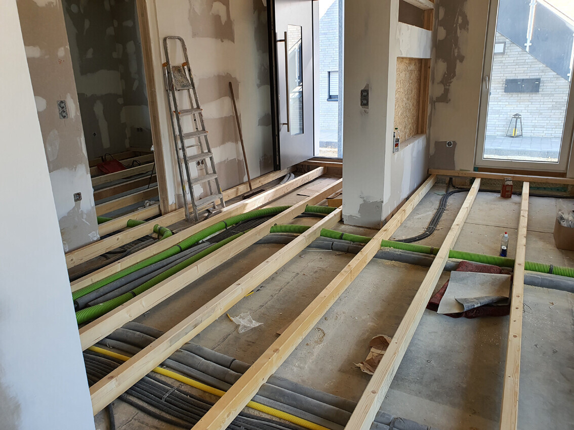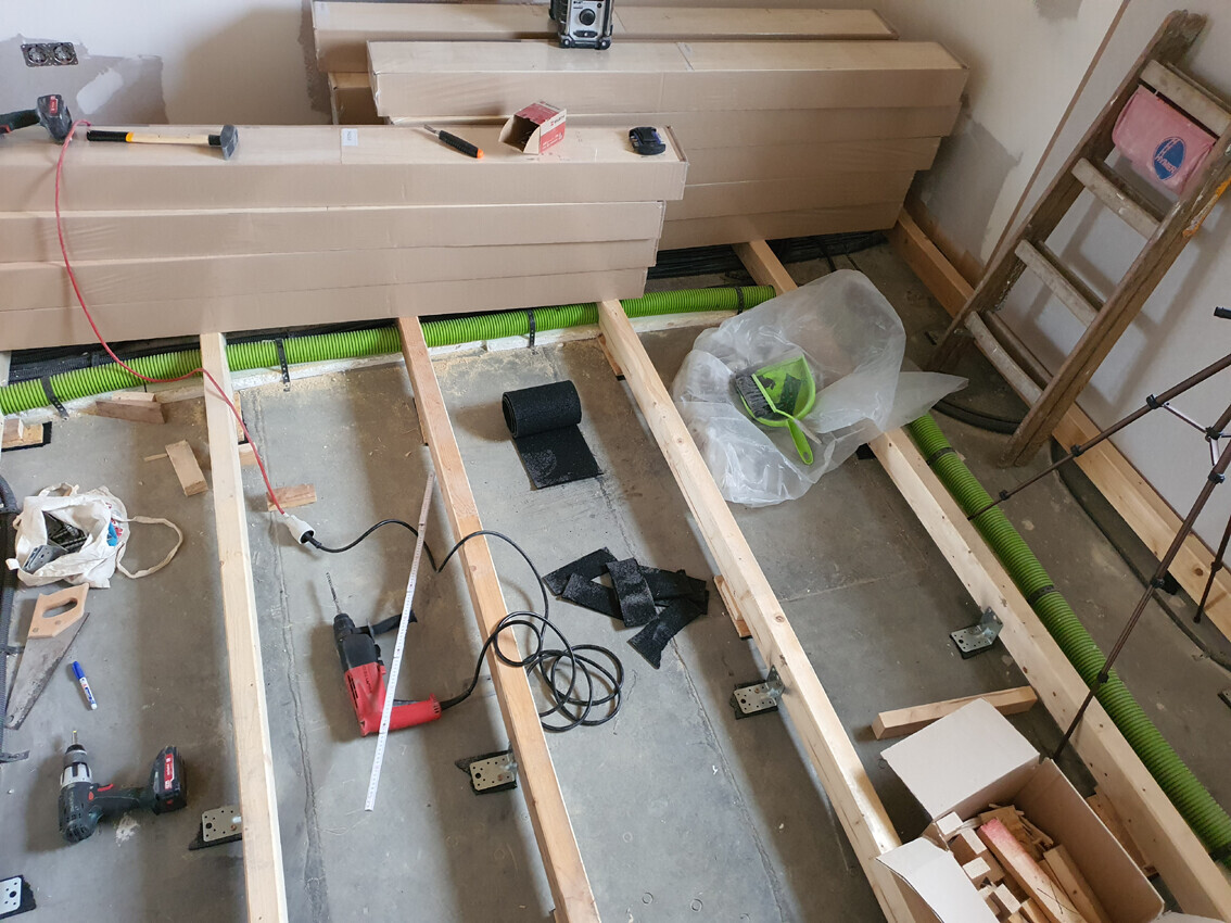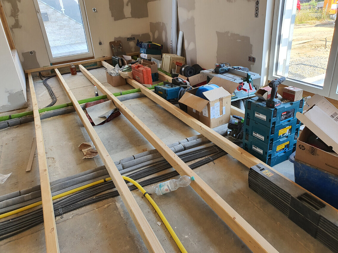 Randhölzer mit Baulaser ausnivelliert, anschliessend Balken darunter geschraubt und dann diese mit Winkeln ins Wasser gebracht, immer hübsch Bautenschutzmattenabschnitte als Dämpfung darunter.