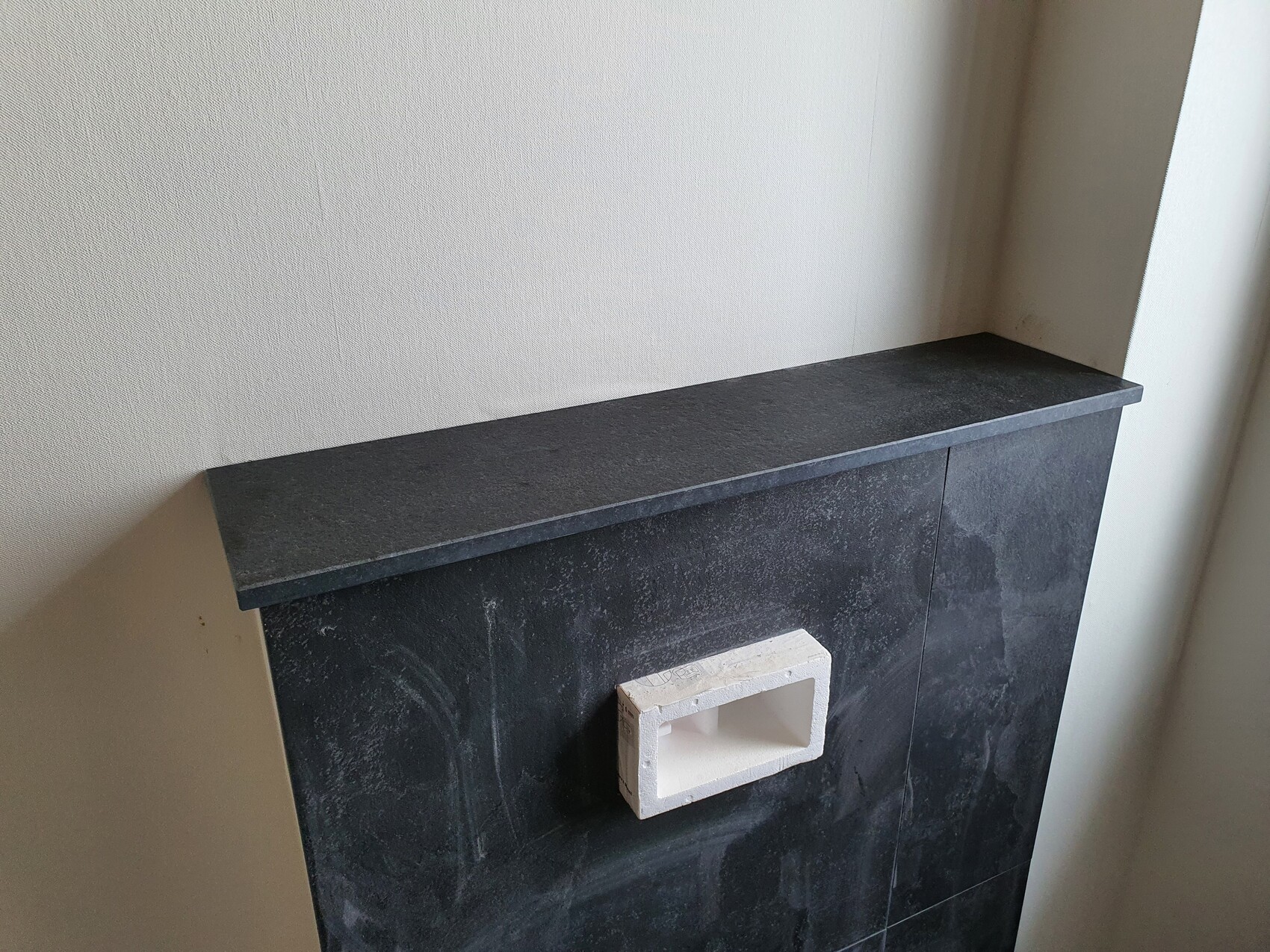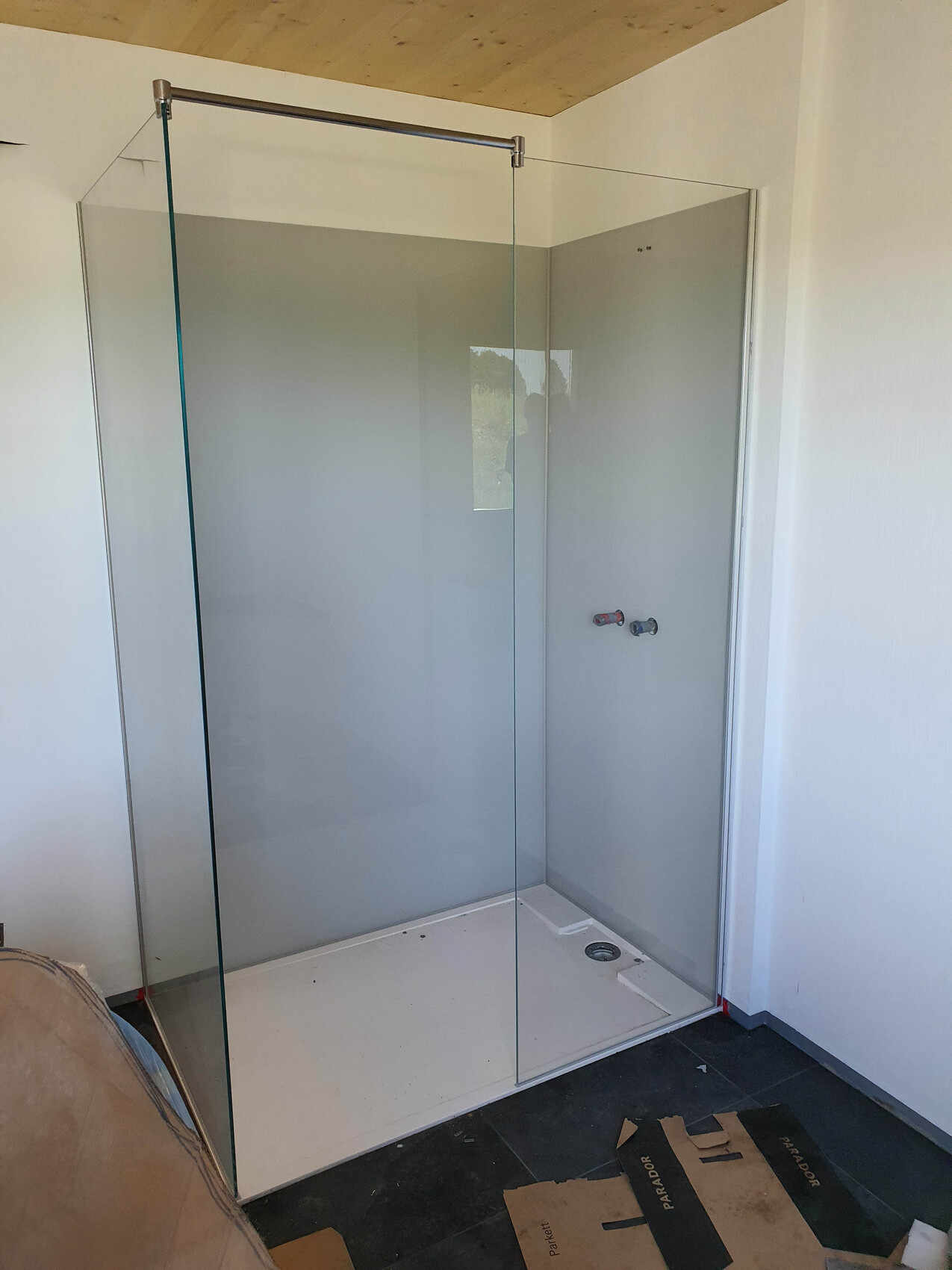 Das Glas für alle Duschen ist montiert, ebenso alle Fensterbänke und Ablagen. Leider fehlen noch drei Glasscheiben so das noch nicht alle Sockelfliesen angebracht werden können 😕.