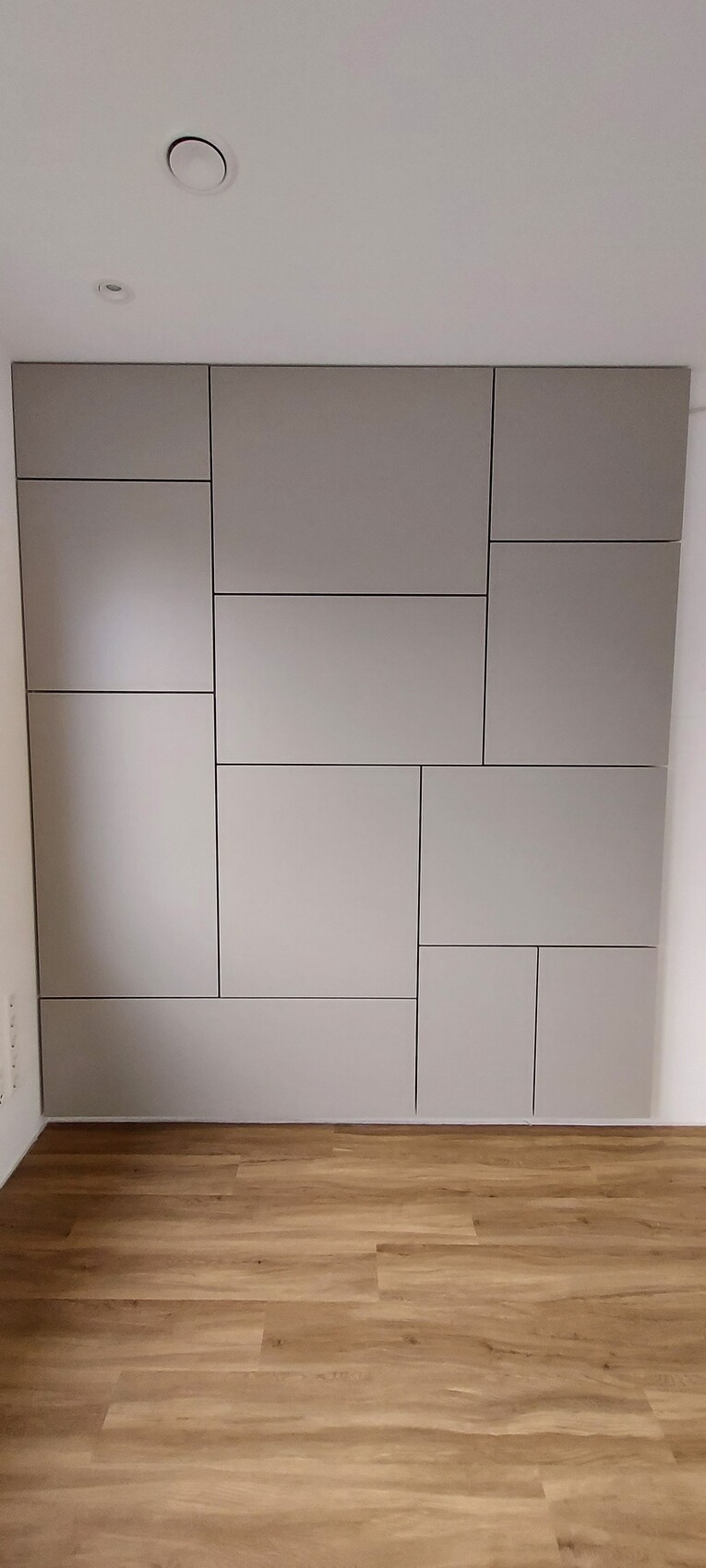 Wandverkleidung mal etwas anders.Ich mag die Umsetzung eigener Ideen. Sieht sauber gearbeitet aus.Erinnert mich an Piet Mondrian, nur Ton in Ton und wandfüllend.