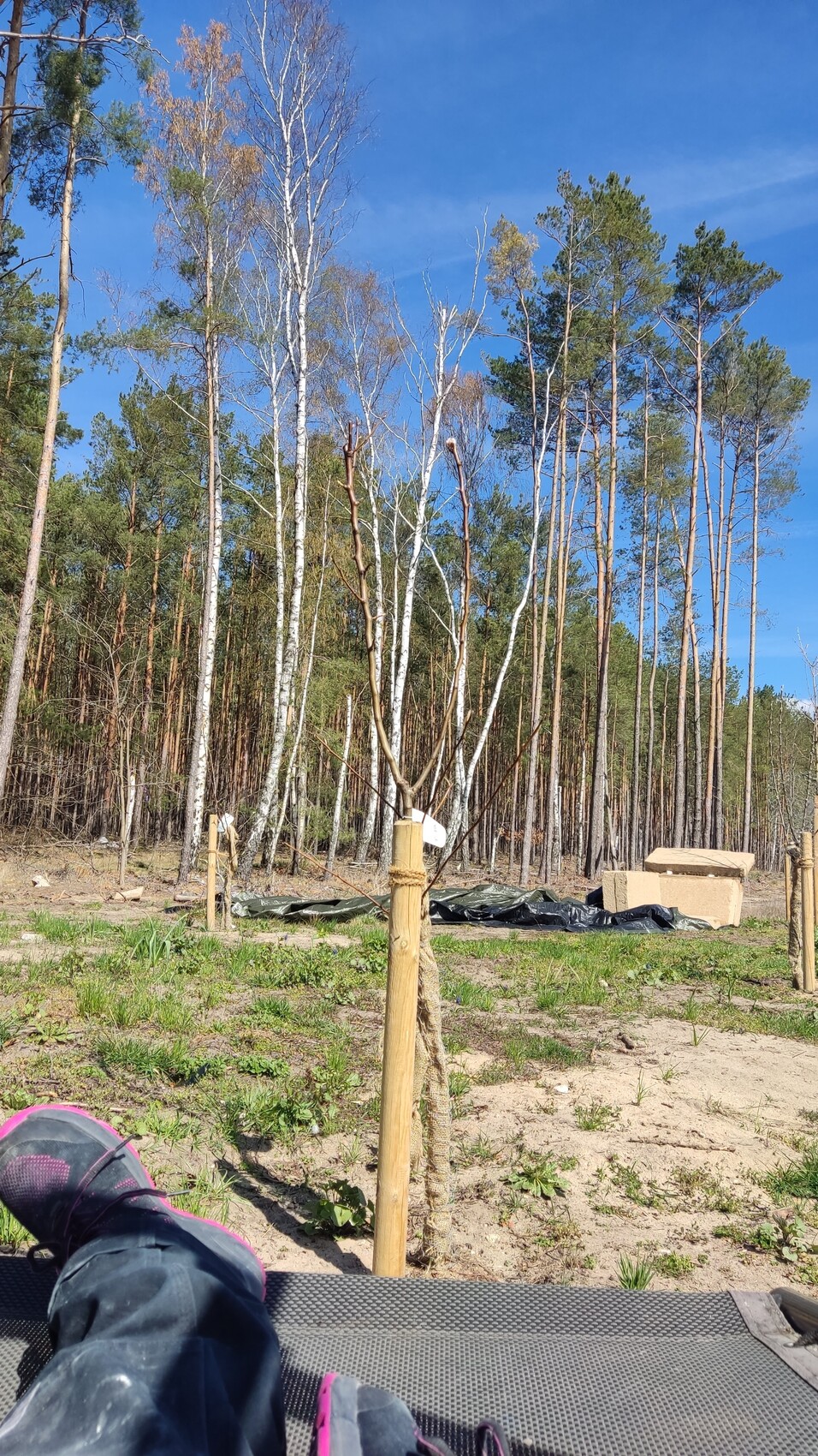 Liege grade auf der Schaukel (die wir gekauft haben damit ich mit dem gebrochenen Fuß auf der Baustelle dabei sein kann) und schaue in den Wald (und auf unsere trocknenden Dämmmattten ).