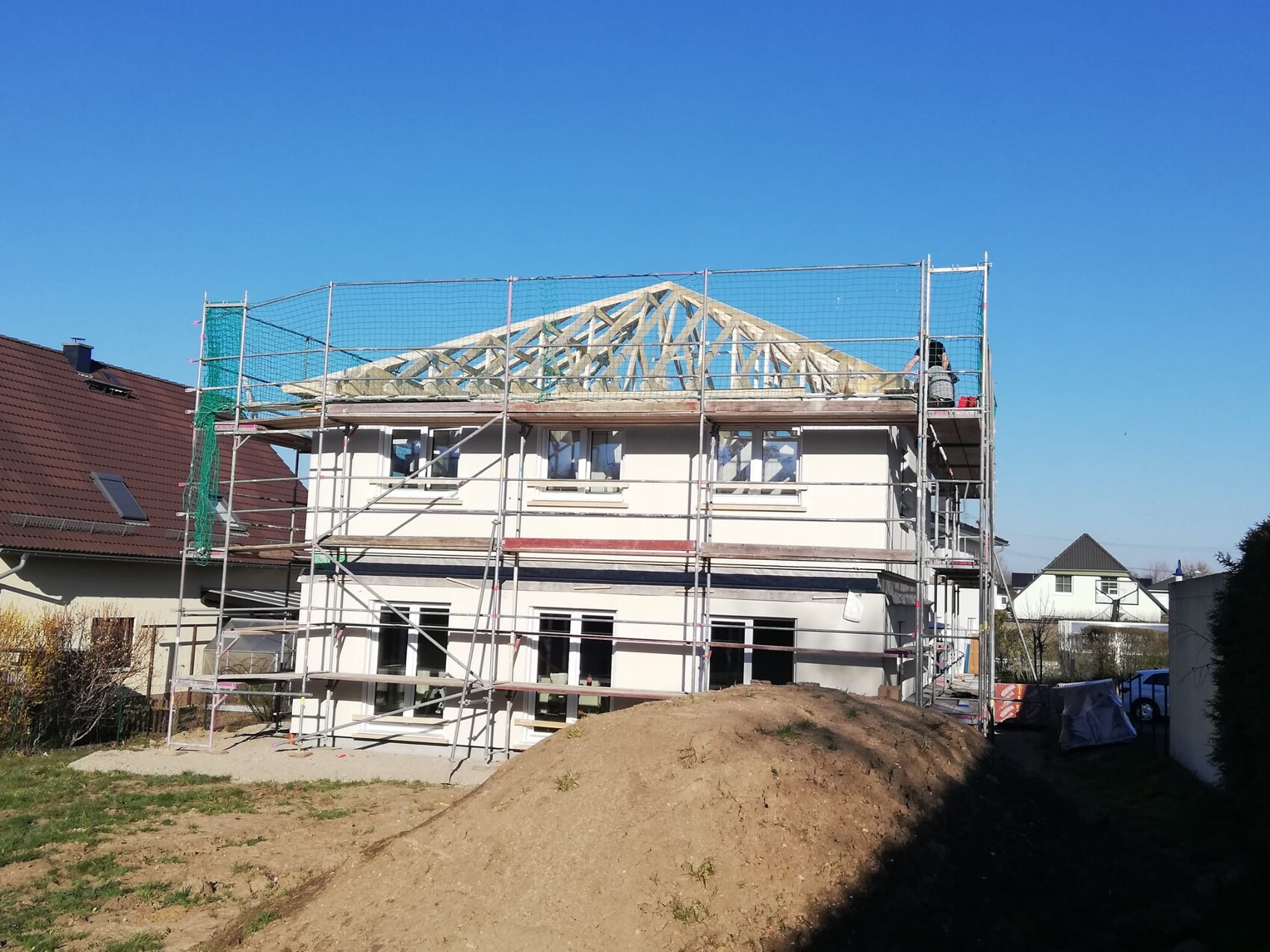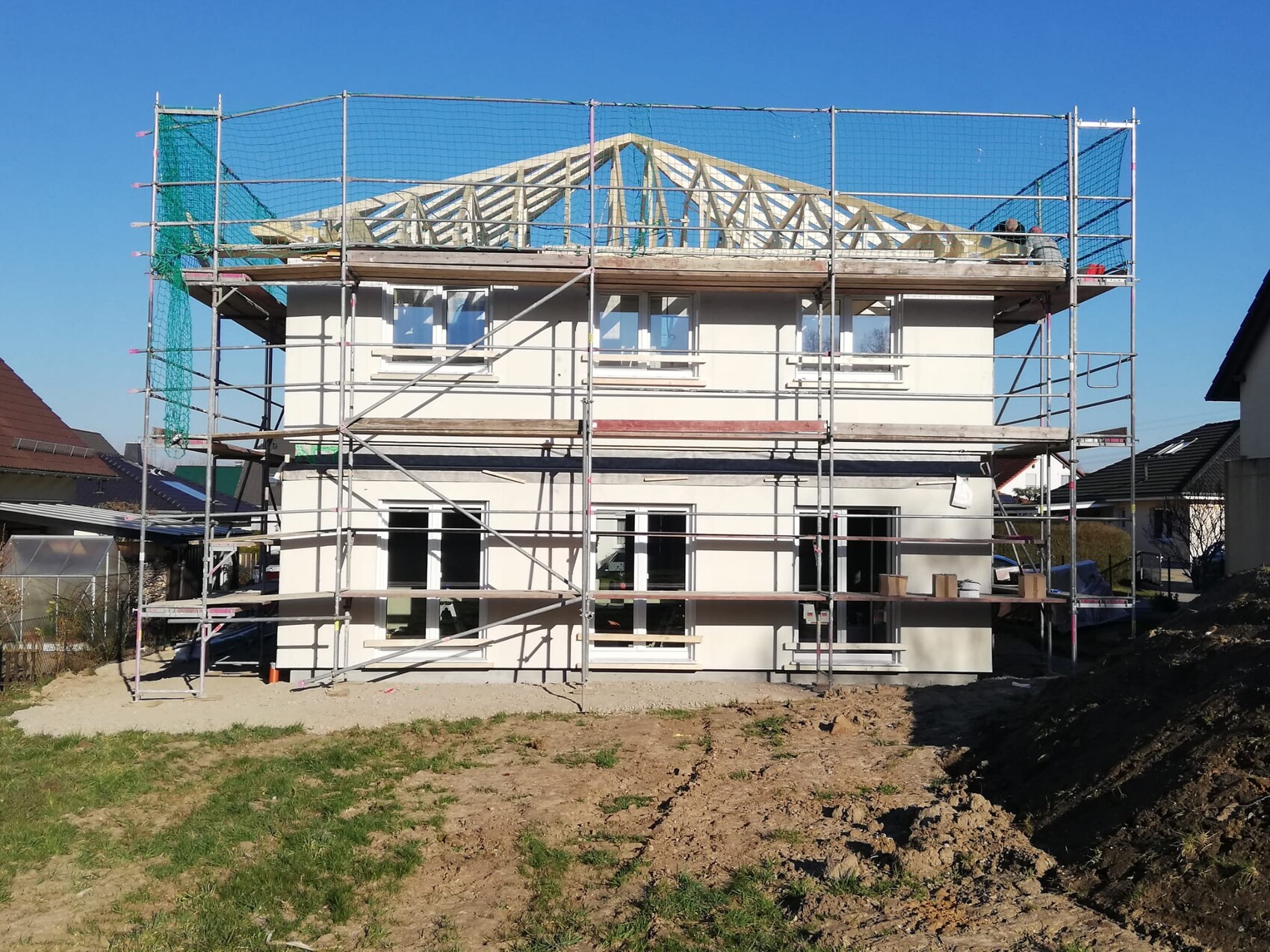 Für mich ein großer Moment, auf den ich mindestens drei Jahre gewartet habe. 🙂 Nun endlich unsere ersten Hausbilder, auch wenn das Haus noch nicht fertig ist und man nicht ganz so viel sieht, weil es noch eingerüstet ist. Bis jetzt finde ich das Haus gelungen, auch wenn es nicht originell oder besonders ist; ein einfaches Haus, das mir gerade in seiner Schlichtheit zusagt und das ich auch darum gefällig finde. Den (aus finanziellen Gründen) Verzicht auf die Sprossenfester und -türen finde ich jetzt auch nicht mehr so schlimm.
