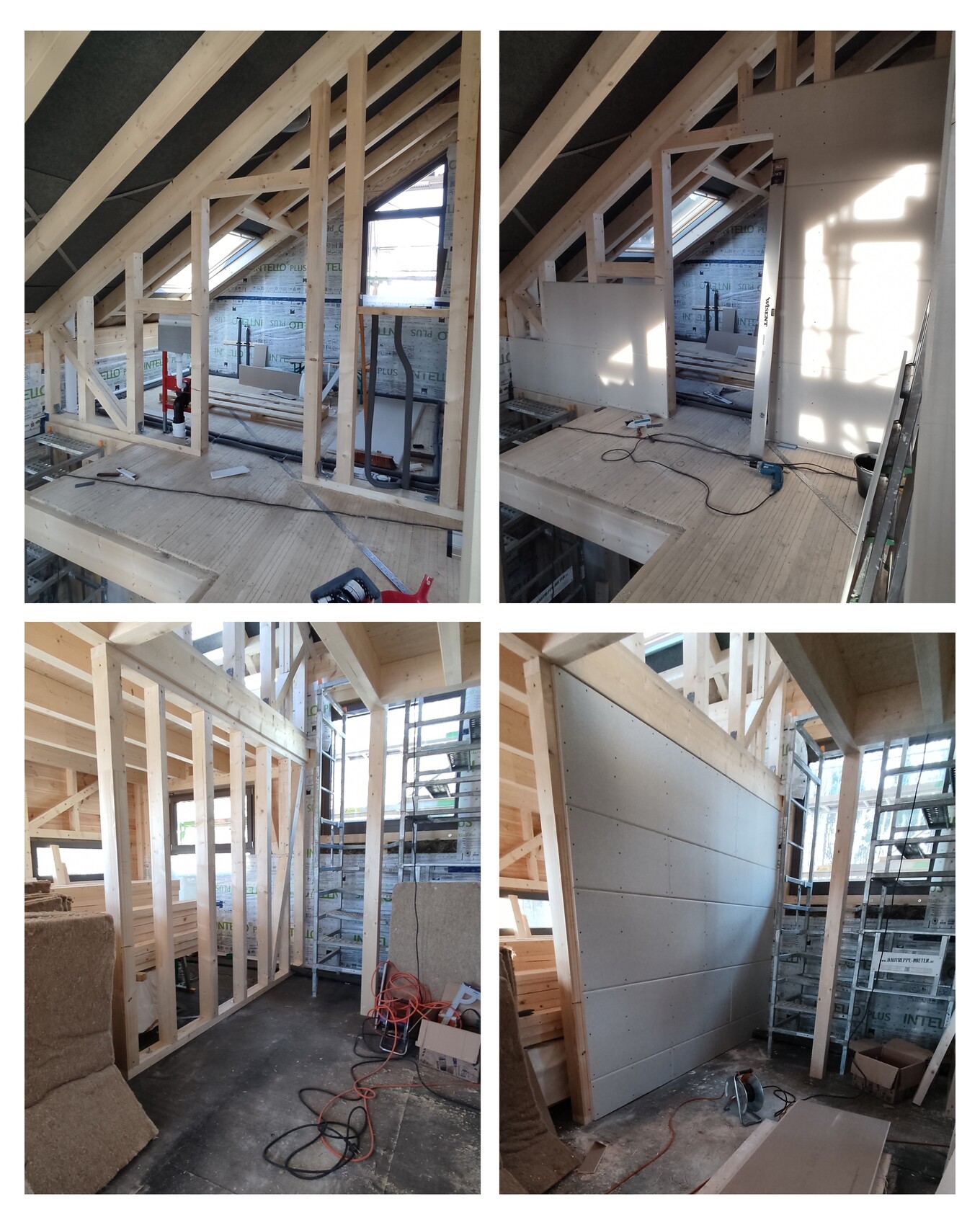 Auf Bild zwei seht ihr oben die Badwand, die wir erstmal einlagig beplankt haben. Wir wollen erst das Dach beplanken, damit wir uns jetzt nicht verrechnen und dann die Dachgipskartonplatten nicht mehr passen. Außerdem müssen wir uns noch entscheiden ob die zweite Lage mit Holz verbohlt wird oder nicht.